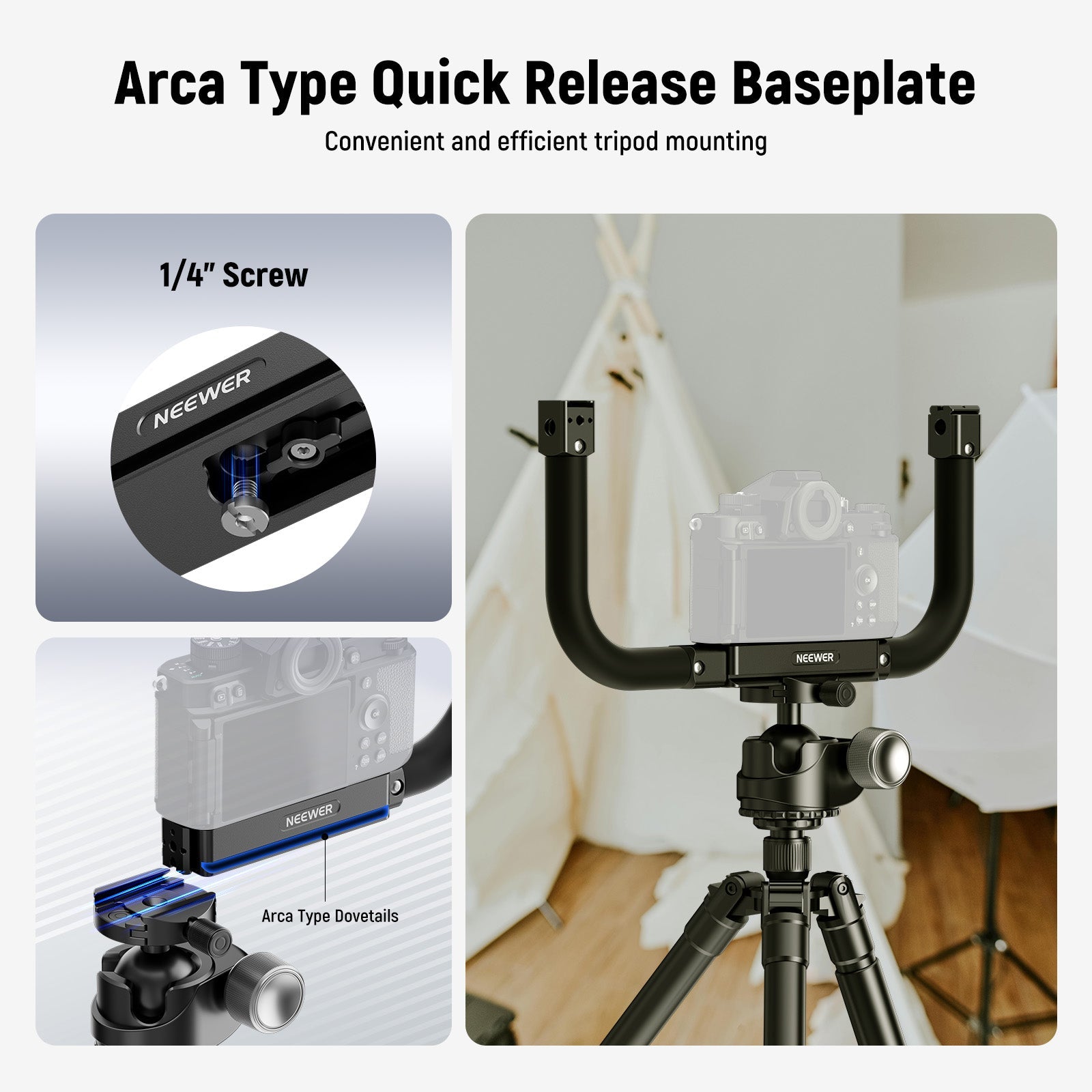 • Placa base de liberación rápida tipo Arca : la placa base tipo Arca estándar es compatible con una amplia gama de cabezales de trípode, cabezales de video y cabezales fluidos para un montaje conveniente y seguro.