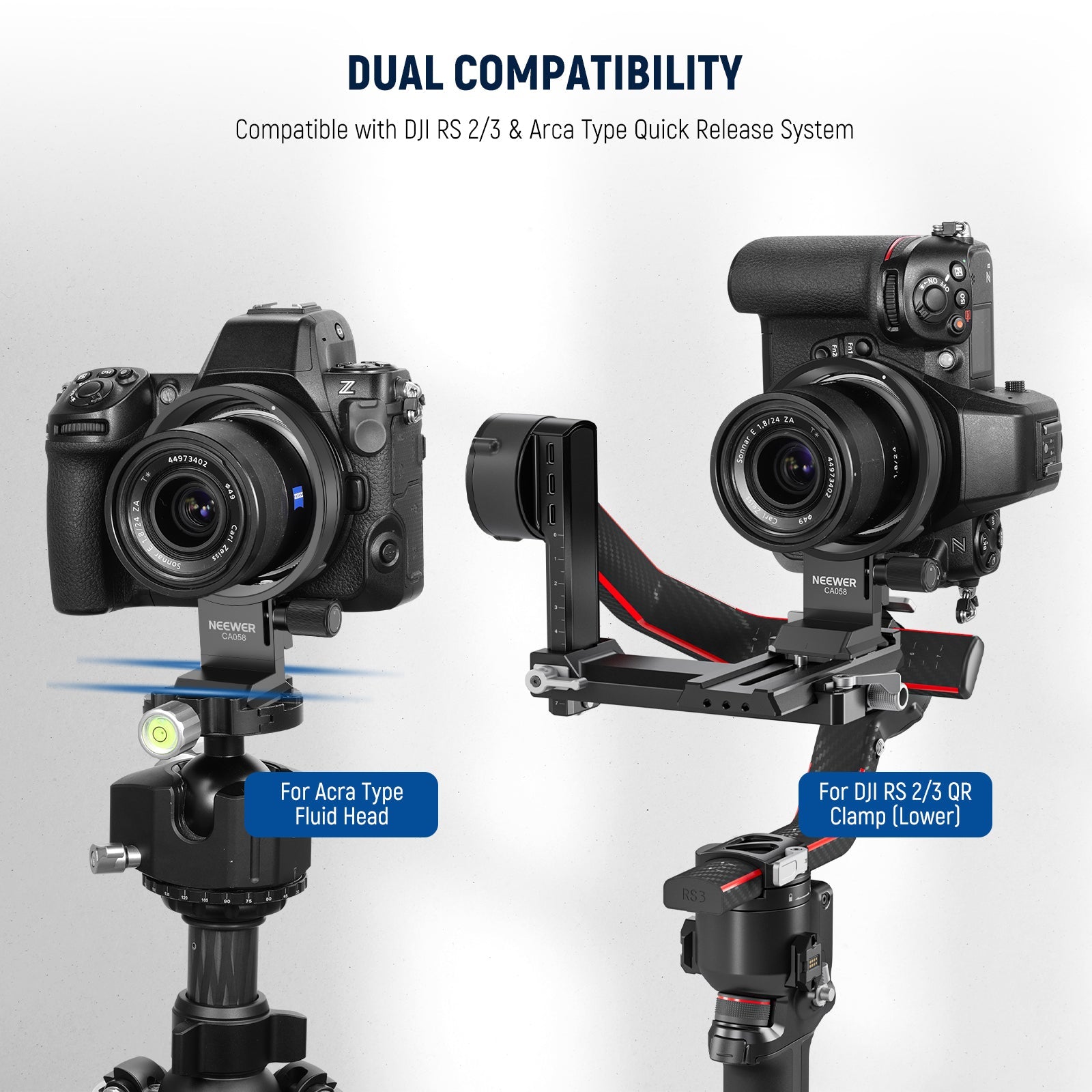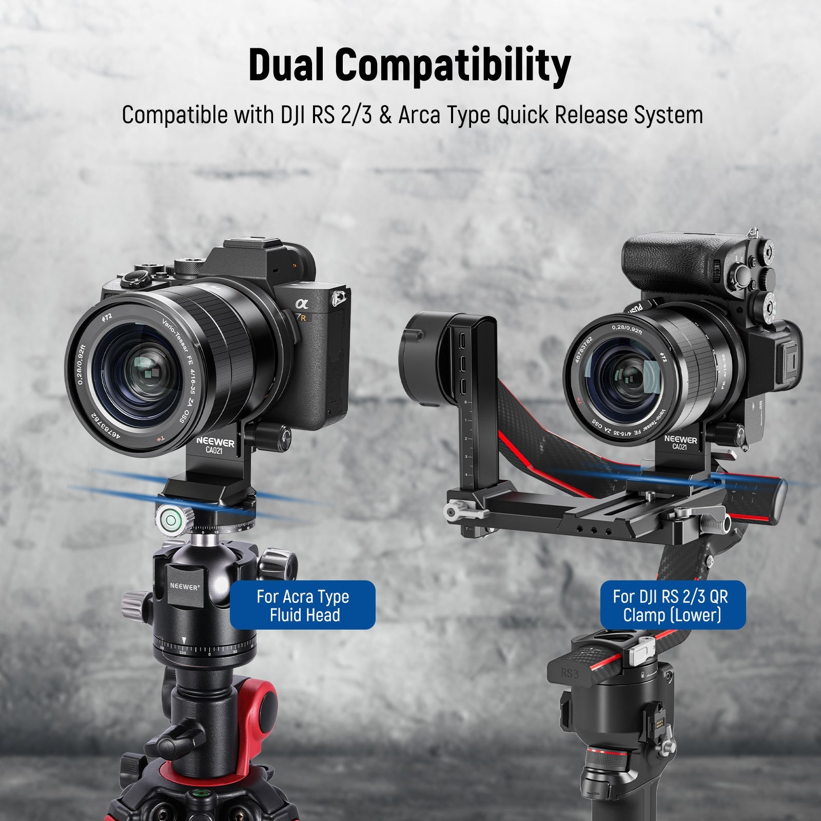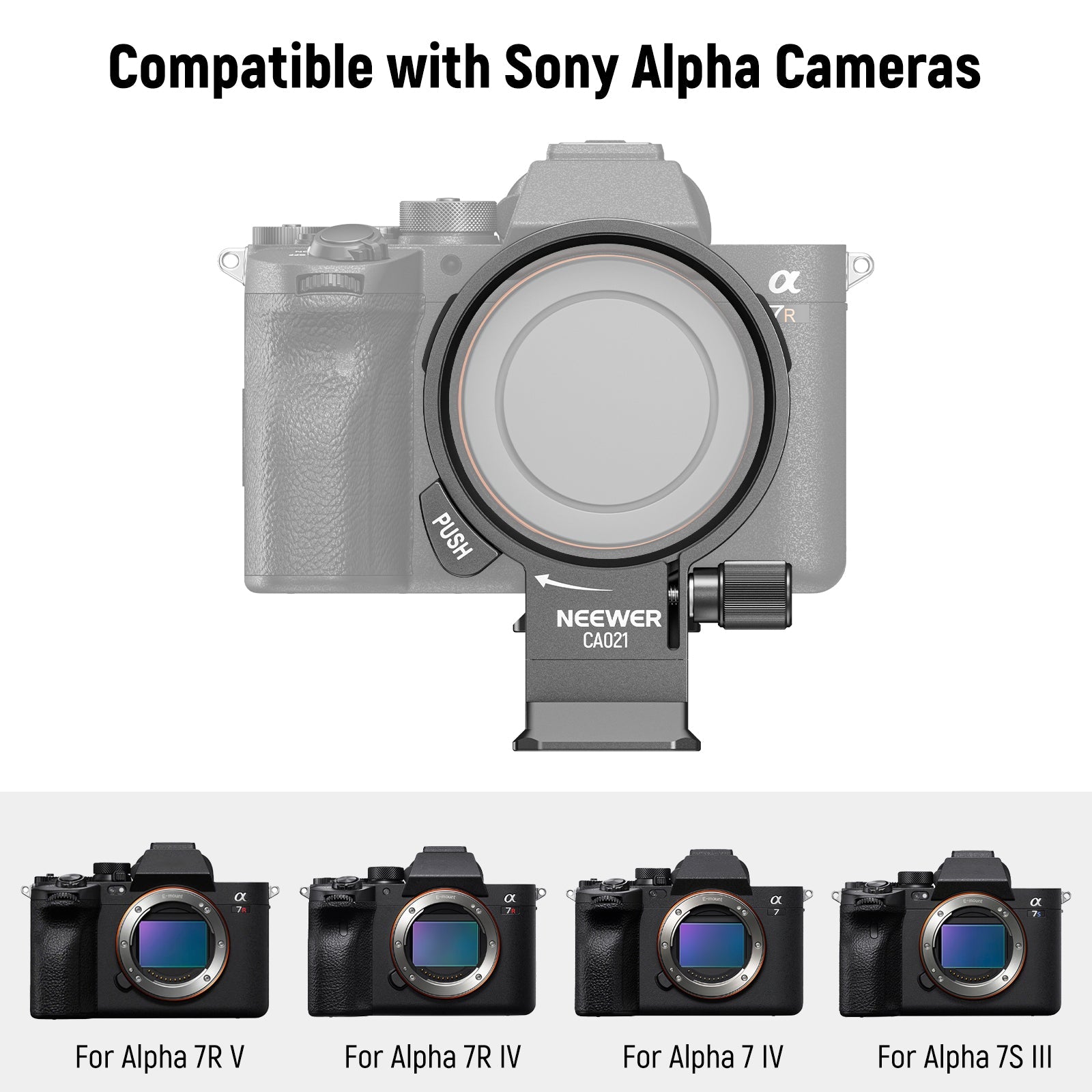 - Diseño adaptable : Esta placa base para cámara con collar giratorio NEEWER CA021 , fabricada en aleación de aluminio anodizado CNC, es totalmente compatible con las cámaras Sony Alpha 7R IV, Alpha 7R V, Alpha 7 IV y Alpha 7S III. Mejora el equilibrio al usar teleobjetivos, permite cambiar fácilmente entre tomas horizontales y verticales y permite un acceso completo a la pantalla LCD abatible, los puertos y las funciones de la cámara mientras está montada de forma segura en un trípode.