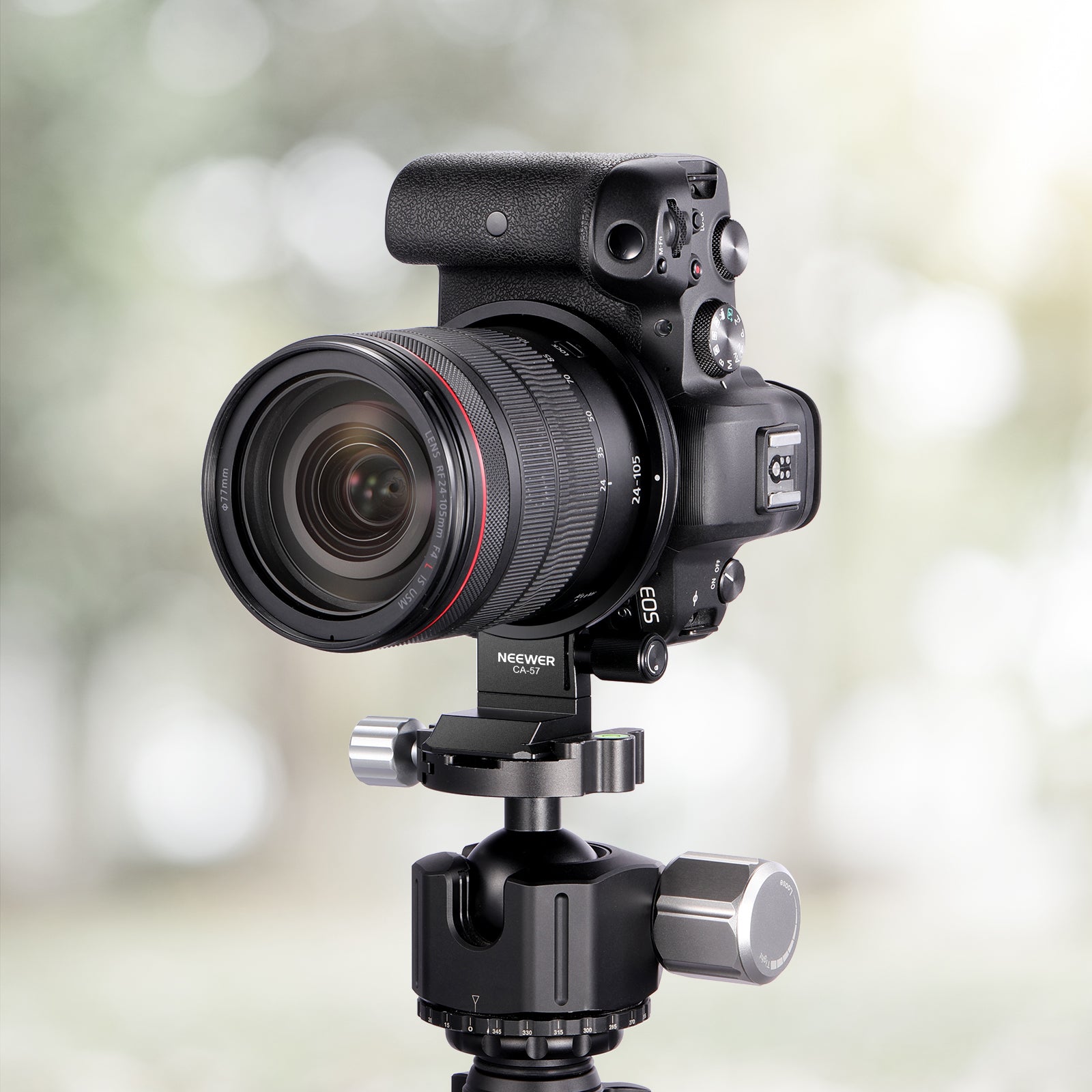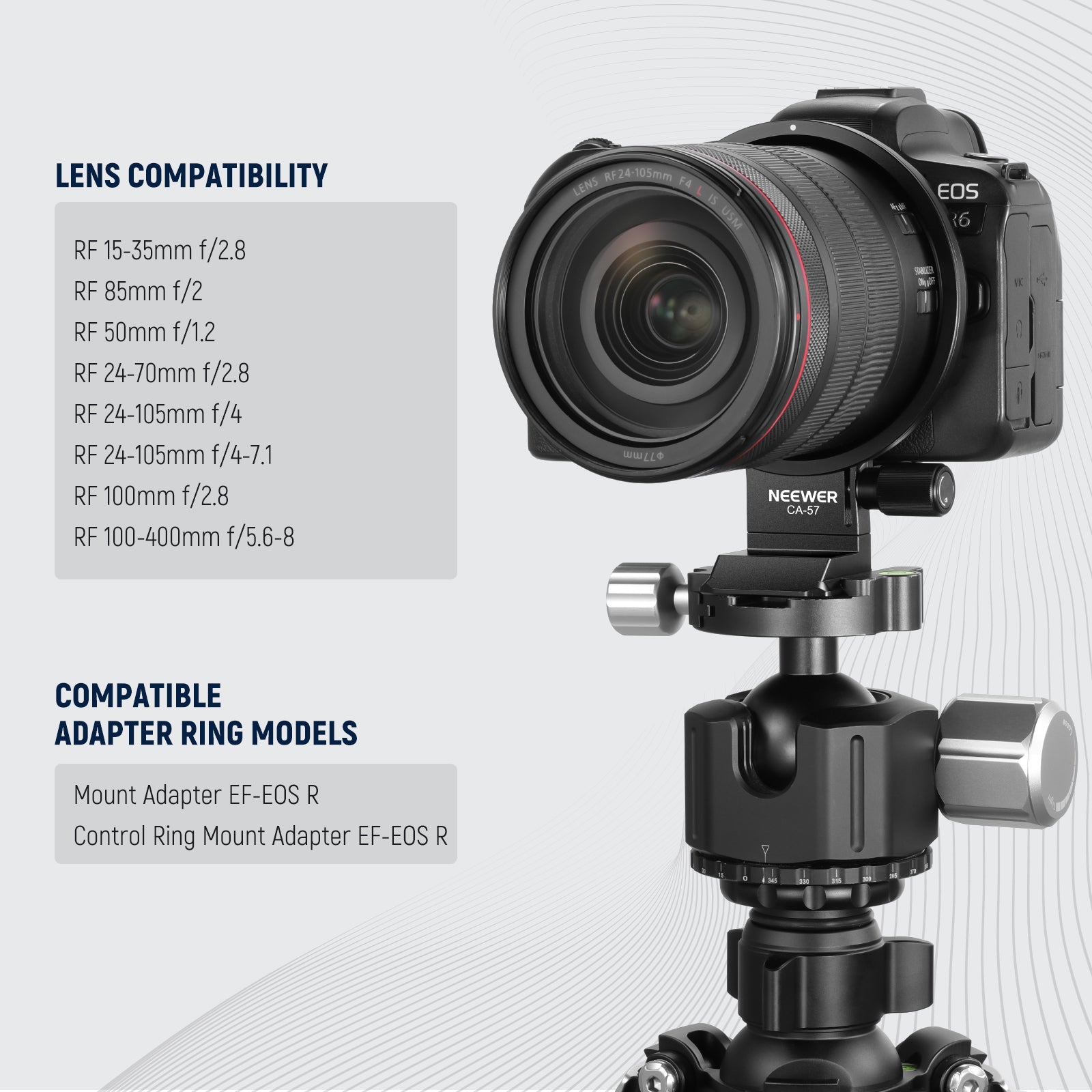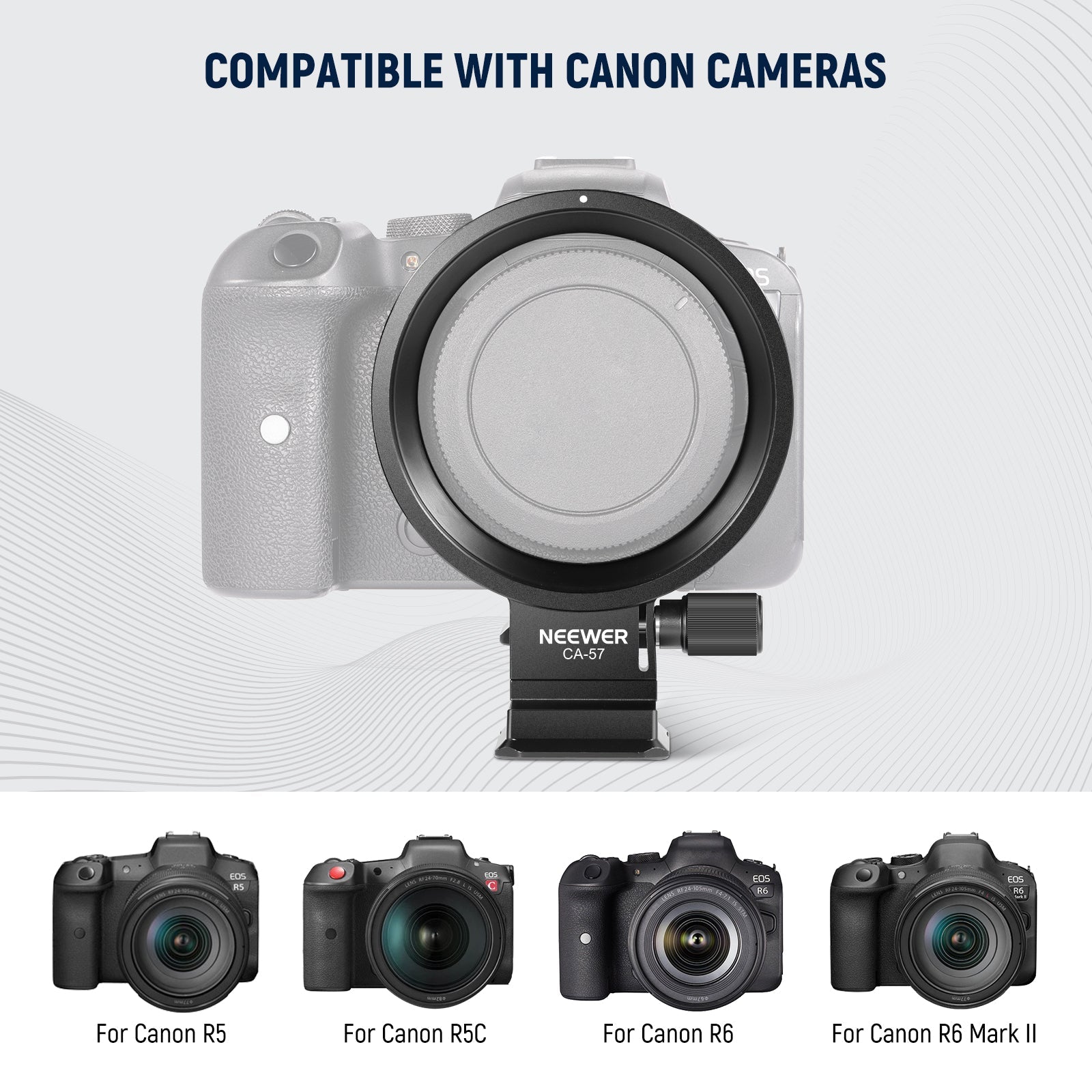 - Ángulos flexibles y equilibrio mejorado : Esta placa de montaje de cámara con collar giratorio NEEWER CA-57 permite tomas horizontales y verticales rápidas y sin interrupciones con una estabilidad superior y mejora el equilibrio al usar objetivos pesados. Compatible con cámaras Canon R5 / R5C / R6 / R6 Mark II de fotograma completo, compatible con el adaptador de montura Canon EF EOS R y el adaptador de montura de anillo de control, compatible con objetivos RF 24-70 mm f/2.8, 24-105 mm f/4, 24-105 mm f/4-7.1, 85 mm f/2, 50 mm f/1.2, 100-400 mm f/5.6-8, 15-35 mm f/2.8 y 100 mm f/2.8.