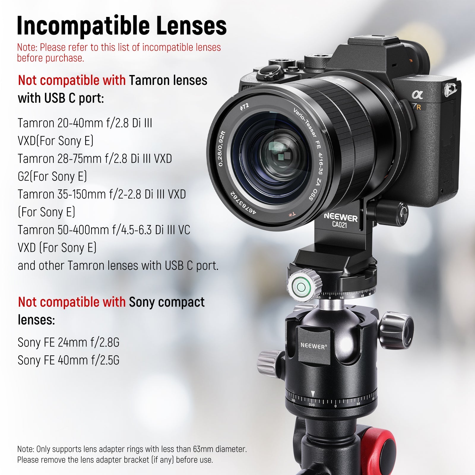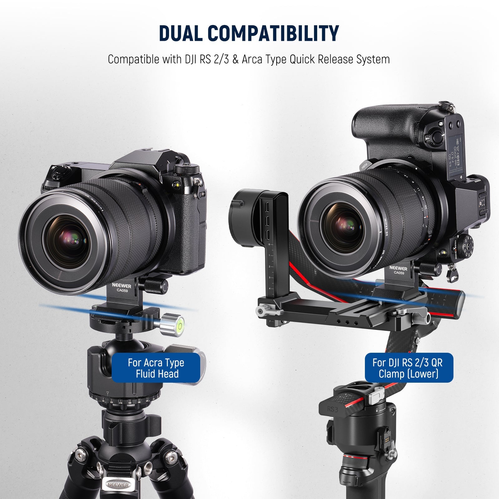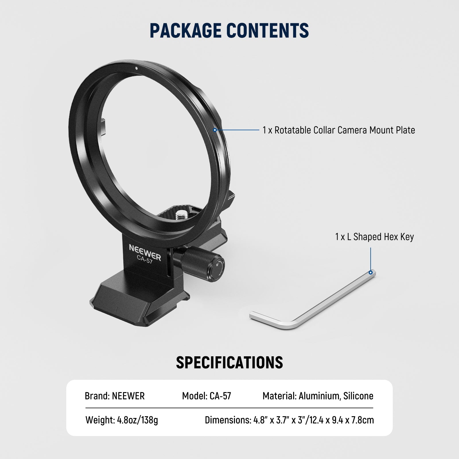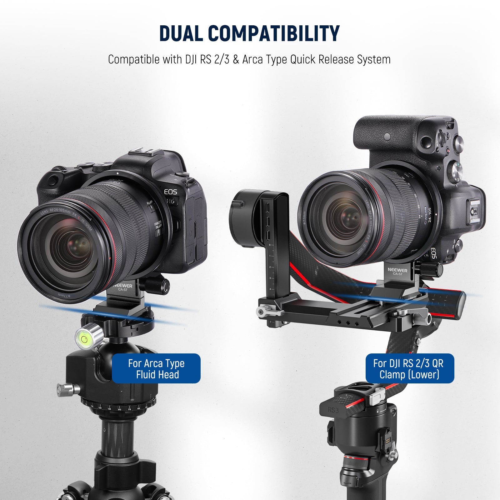 - Ángulos flexibles y equilibrio mejorado : Esta placa de montaje de cámara con collar giratorio NEEWER CA-57 permite tomas horizontales y verticales rápidas y sin interrupciones con una estabilidad superior y mejora el equilibrio al usar objetivos pesados. Compatible con cámaras Canon R5 / R5C / R6 / R6 Mark II de fotograma completo, compatible con el adaptador de montura Canon EF EOS R y el adaptador de montura de anillo de control, compatible con objetivos RF 24-70 mm f/2.8, 24-105 mm f/4, 24-105 mm f/4-7.1, 85 mm f/2, 50 mm f/1.2, 100-400 mm f/5.6-8, 15-35 mm f/2.8 y 100 mm f/2.8.