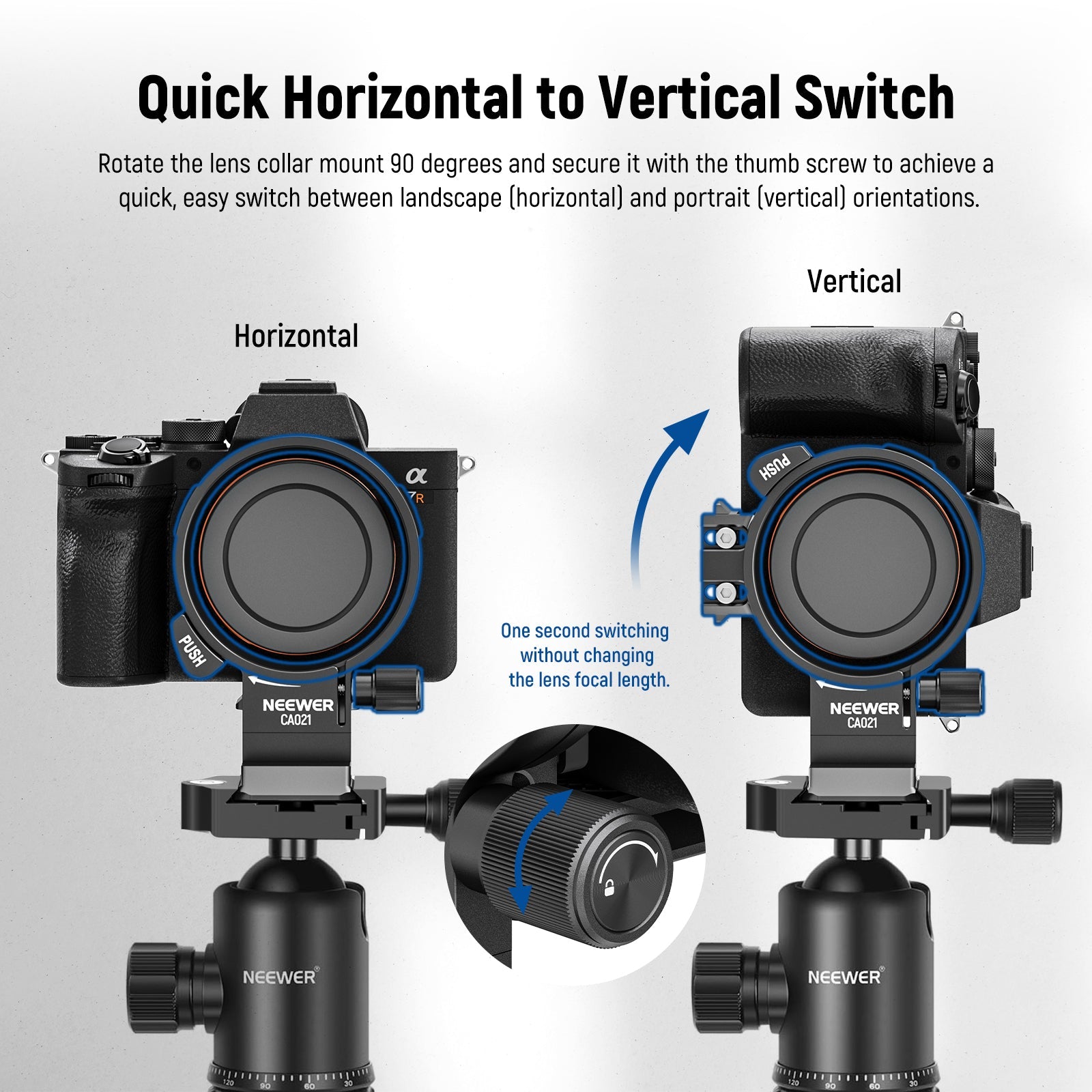 - Cambio rápido de horizontal a vertical : La placa giratoria de la cámara gira el collar del objetivo 90 grados y permite cambiar rápida y fácilmente entre las orientaciones horizontal y vertical en un trípode o estabilizador de cardán sin necesidad de ajustar el eje óptico del objetivo. Nota: Solo es compatible con anillos adaptadores de objetivo con un diámetro inferior a 72 mm. Por seguridad, retire el objetivo antes de instalarlo o retirarlo.