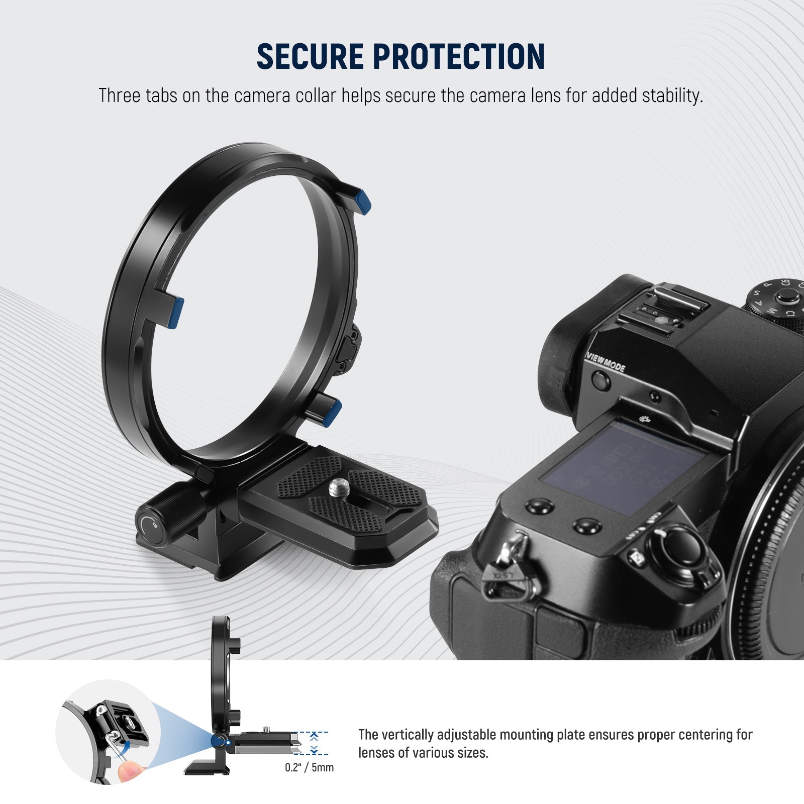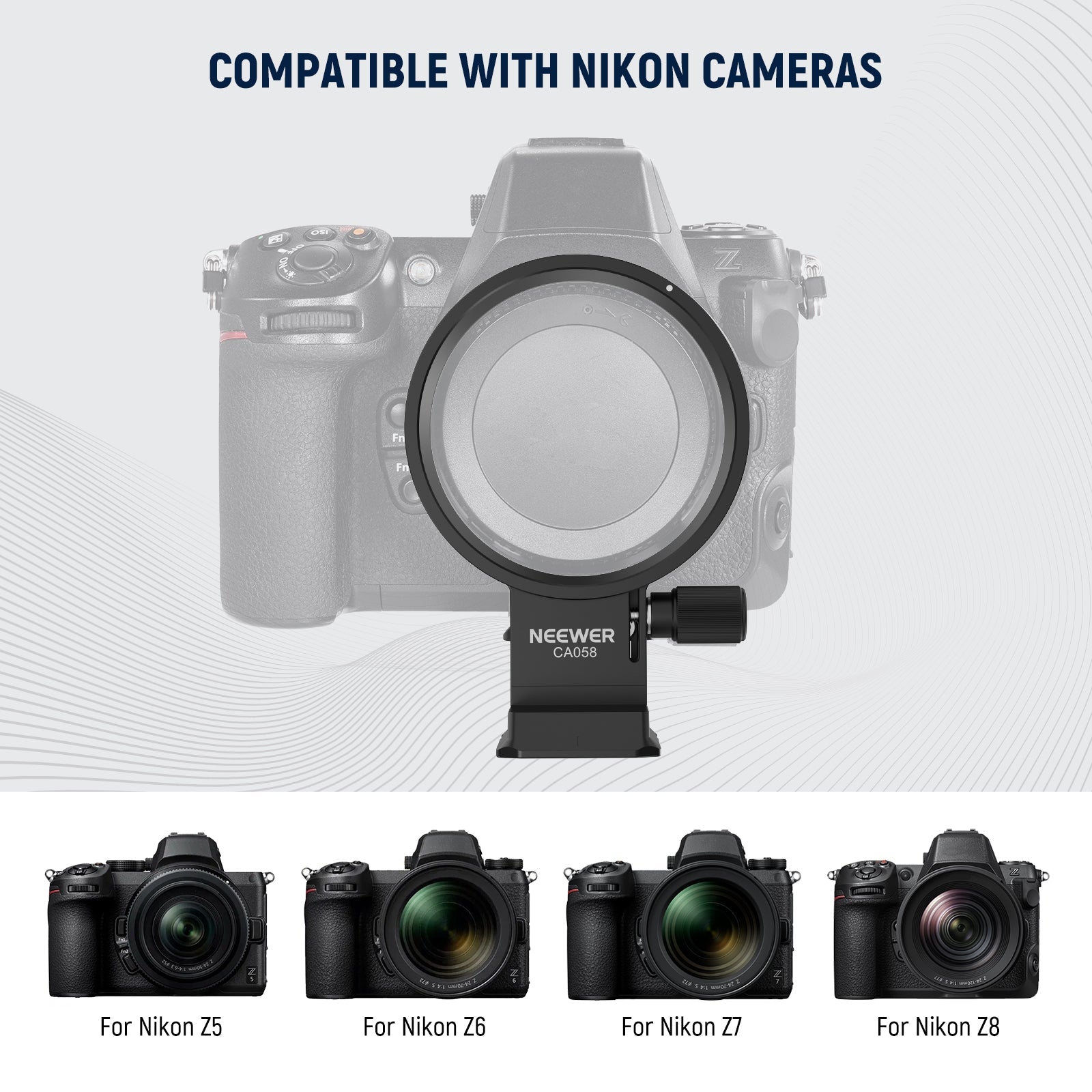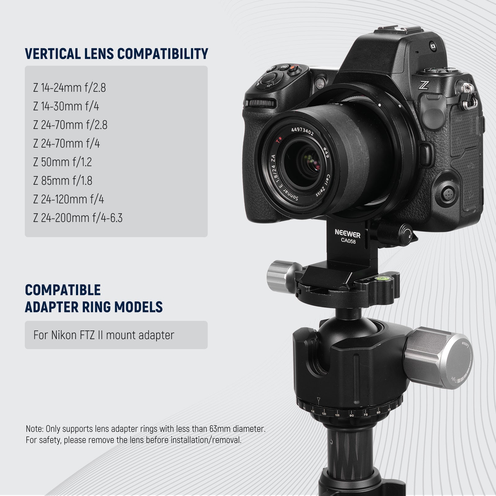 - Ángulos flexibles y mejor equilibrio : Esta placa de montaje para cámara con collar giratorio NEEWER CA058 permite realizar tomas horizontales y verticales de forma rápida y sin problemas, sin comprometer la estabilidad, y mejora el equilibrio al usar teleobjetivos u otros objetivos pesados. Compatible con cámaras Nikon Z8, Z7 II, Z6 II y Z5. Adaptador de montura FTZ II: Z 24-70 mm f/2.8, 50 mm f/1.2, 24-120 mm f/4, 14-24 mm f/2.8, 85 mm f/1.8, 24-70 mm f/4, 14-30 mm f/4 y 24-200 mm f/4-6.3. Nota: No compatible con Z 70-200 mm f/2.8.