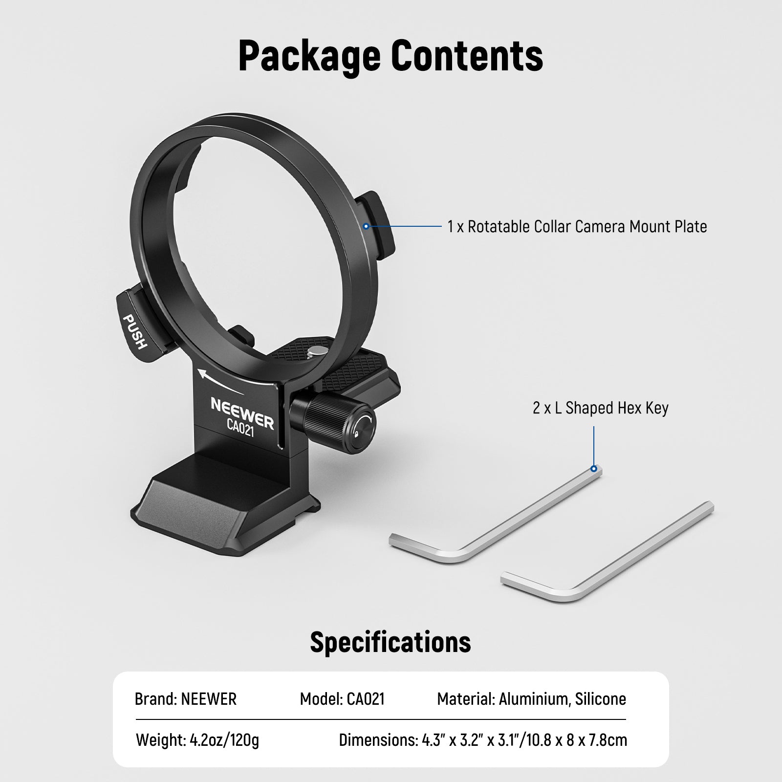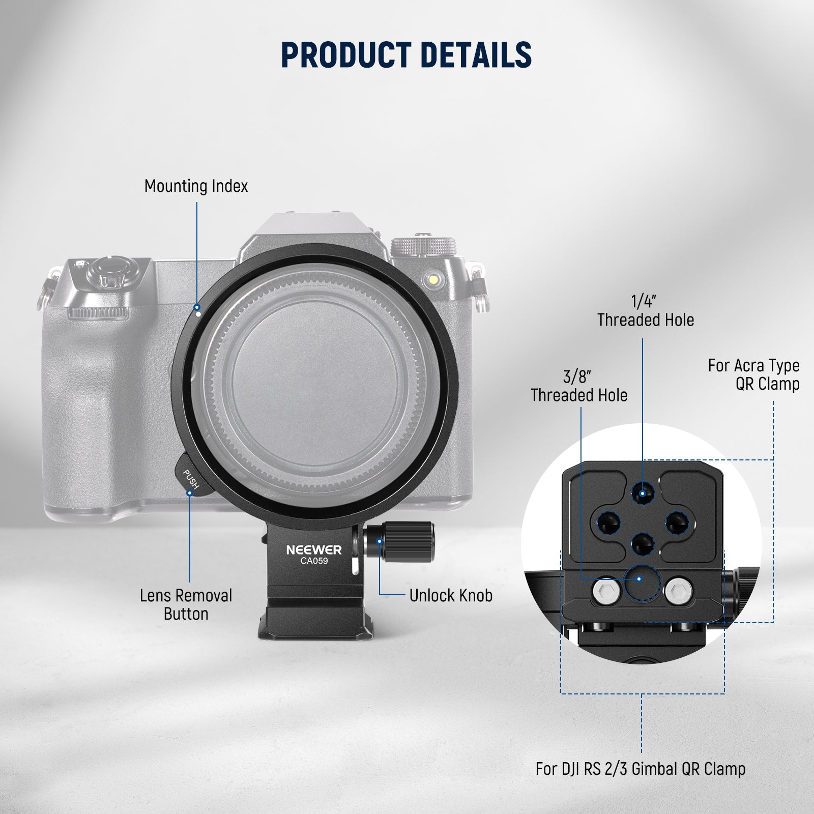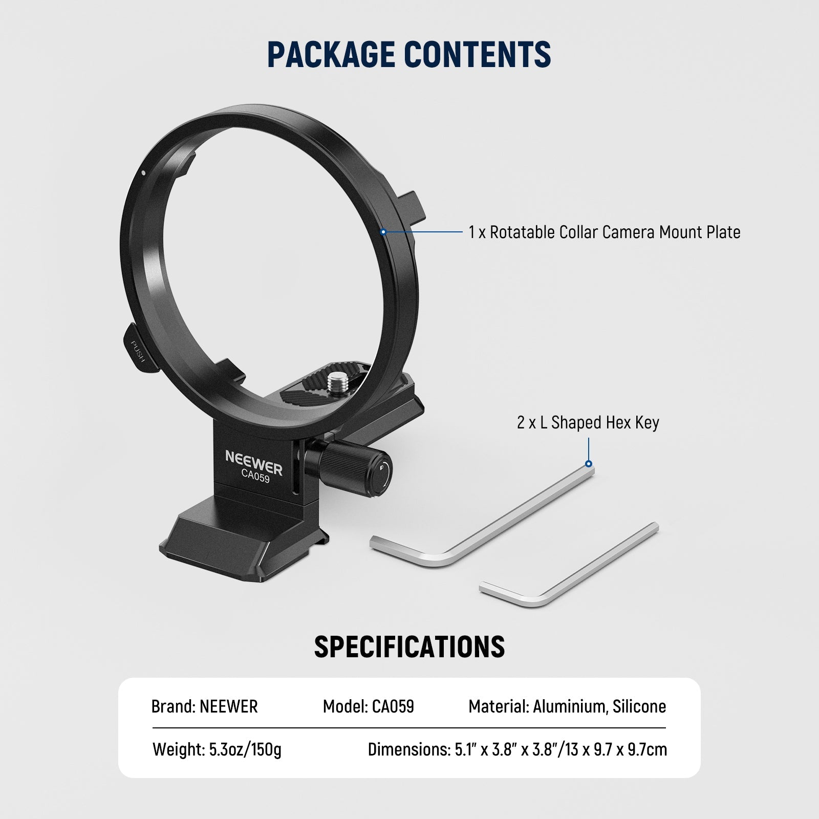 - Ángulos flexibles y mejor equilibrio : Esta placa de montaje para cámara con collar giratorio NEEWER CA058 permite realizar tomas horizontales y verticales de forma rápida y sin problemas, sin comprometer la estabilidad, y mejora el equilibrio al usar teleobjetivos u otros objetivos pesados. Compatible con cámaras Nikon Z8, Z7 II, Z6 II y Z5. Adaptador de montura FTZ II: Z 24-70 mm f/2.8, 50 mm f/1.2, 24-120 mm f/4, 14-24 mm f/2.8, 85 mm f/1.8, 24-70 mm f/4, 14-30 mm f/4 y 24-200 mm f/4-6.3. Nota: No compatible con Z 70-200 mm f/2.8.