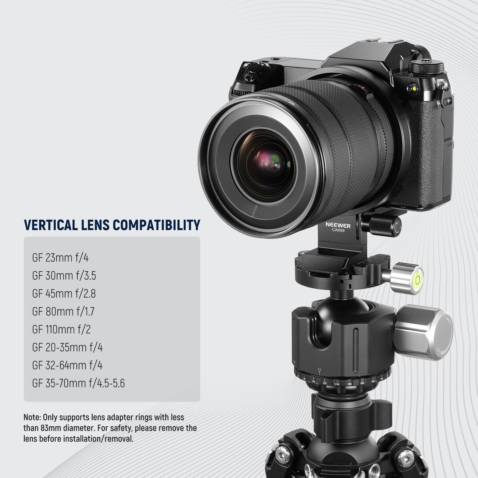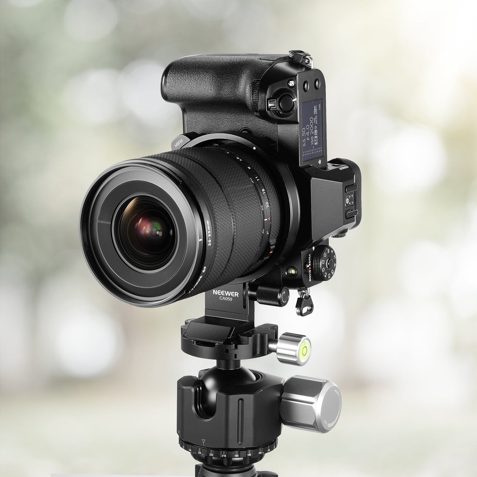 - Ángulos flexibles y equilibrio mejorado : Esta placa de montaje para cámara con collar giratorio NEEWER CA059 permite tomas horizontales y verticales rápidas y sin interrupciones, sin comprometer la estabilidad, y mejora el equilibrio al usar teleobjetivos u otros objetivos pesados. Compatible con cámaras de formato medio Fujifilm GFX 100S / GFX 50S II / GFX100 II y con objetivos GF 20-35 mm f/4, 110 mm f/2, 23 mm f/4, 35-70 mm f/4,5-5,6, 45 mm f/2,8, 30 mm f/3,5, 80 mm f/1,7 y 32-64 mm f/4.