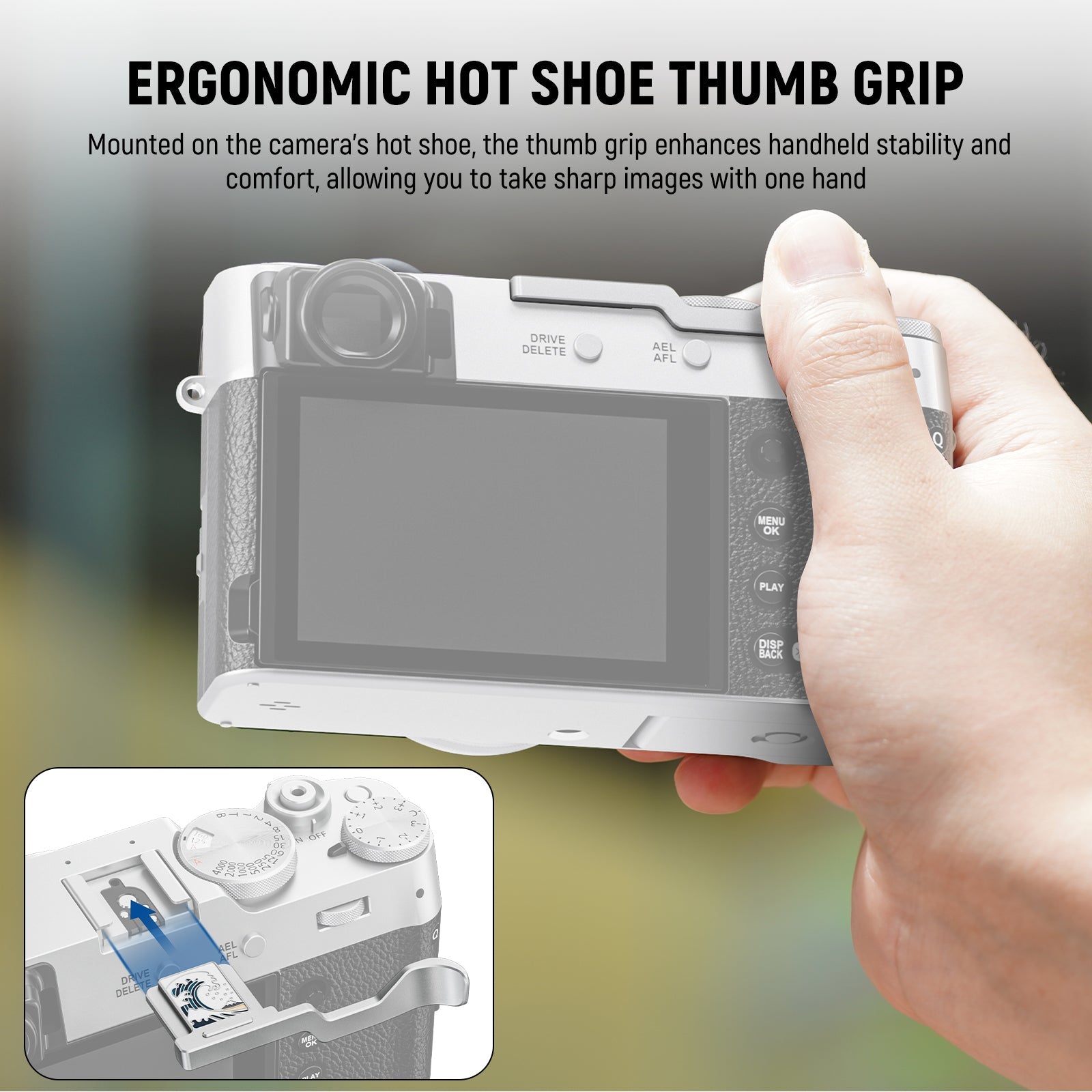- Empuñadura ergonómica para el pulgar con zapata : montada en la zapata de su cámara digital, la empuñadura para el pulgar hacia arriba mejora la estabilidad y la comodidad de la cámara en mano, lo que le permite tomar imágenes nítidas con una mano.