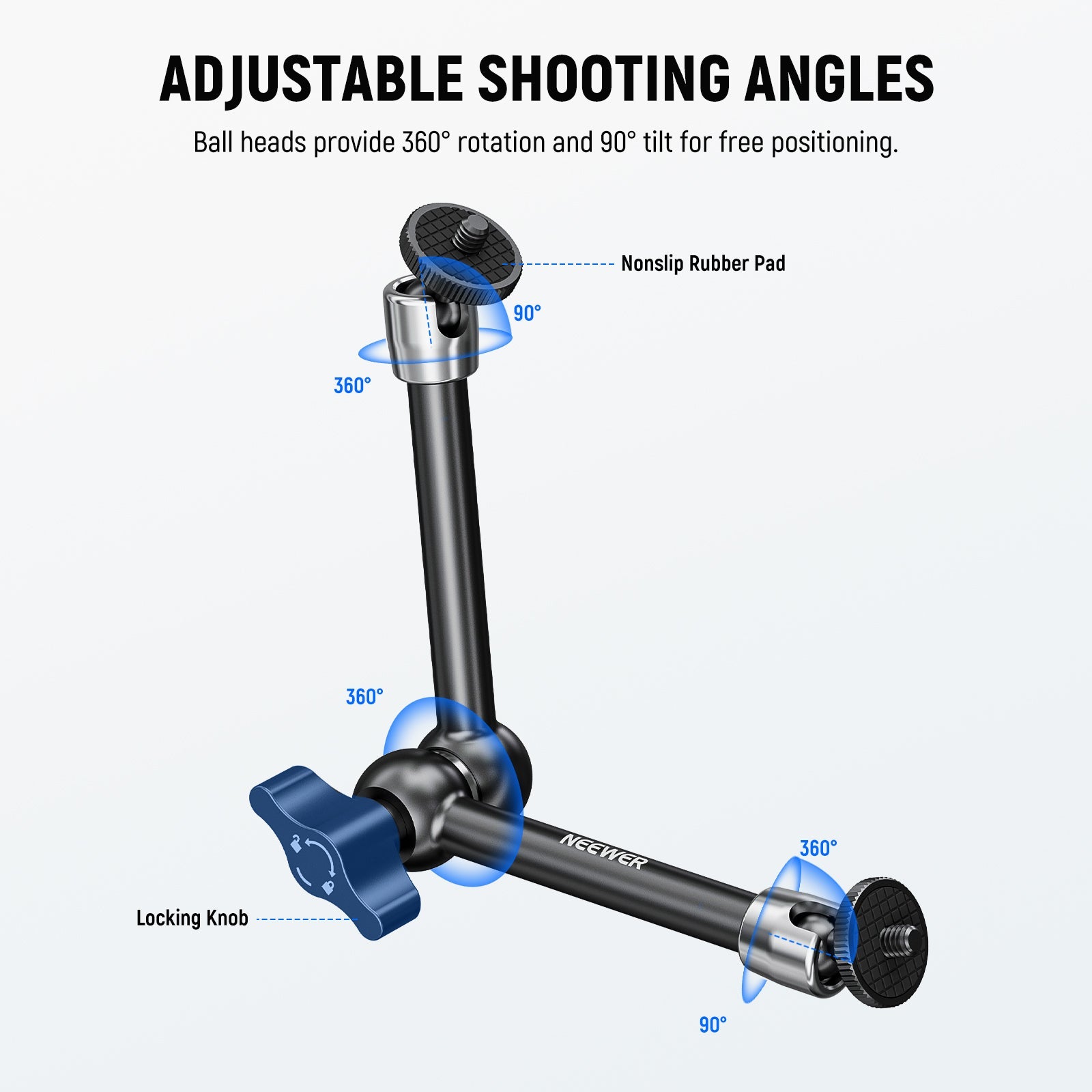 - Cabezas de bola con tornillos de 1/4" - Las cabezas de bola con rotación de 360° e inclinación de 90° permiten un ajuste de ángulo libre. Los tornillos de 1/4" funcionan con jaulas de cámaras, plataformas de video, cámaras DSLR, cámaras de acción, luces de video LED, flashes y monitores de campo. Las placas de montaje con almohadillas de goma protegen el equipo contra rasguños
