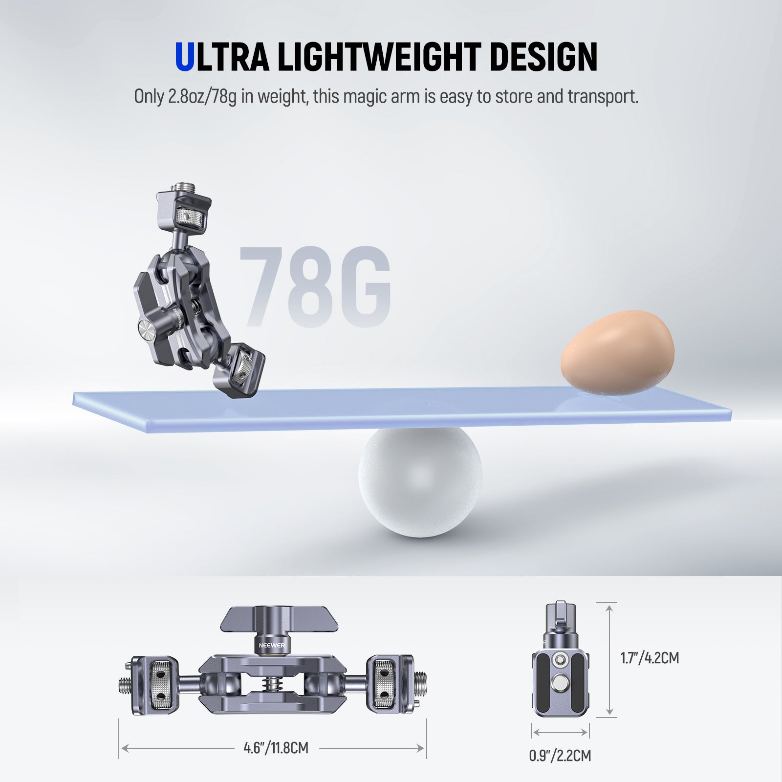 - Diseño ultraligero : optimizado con un peso reducido (2,8 oz/78 g), este brazo mágico es ideal para fotografía al aire libre, cine, vlogging y transmisión en vivo. Con 4,6"x1,7"x0,9"/118x42x22 mm, es portátil y fácil de colocar dentro de su bolsa