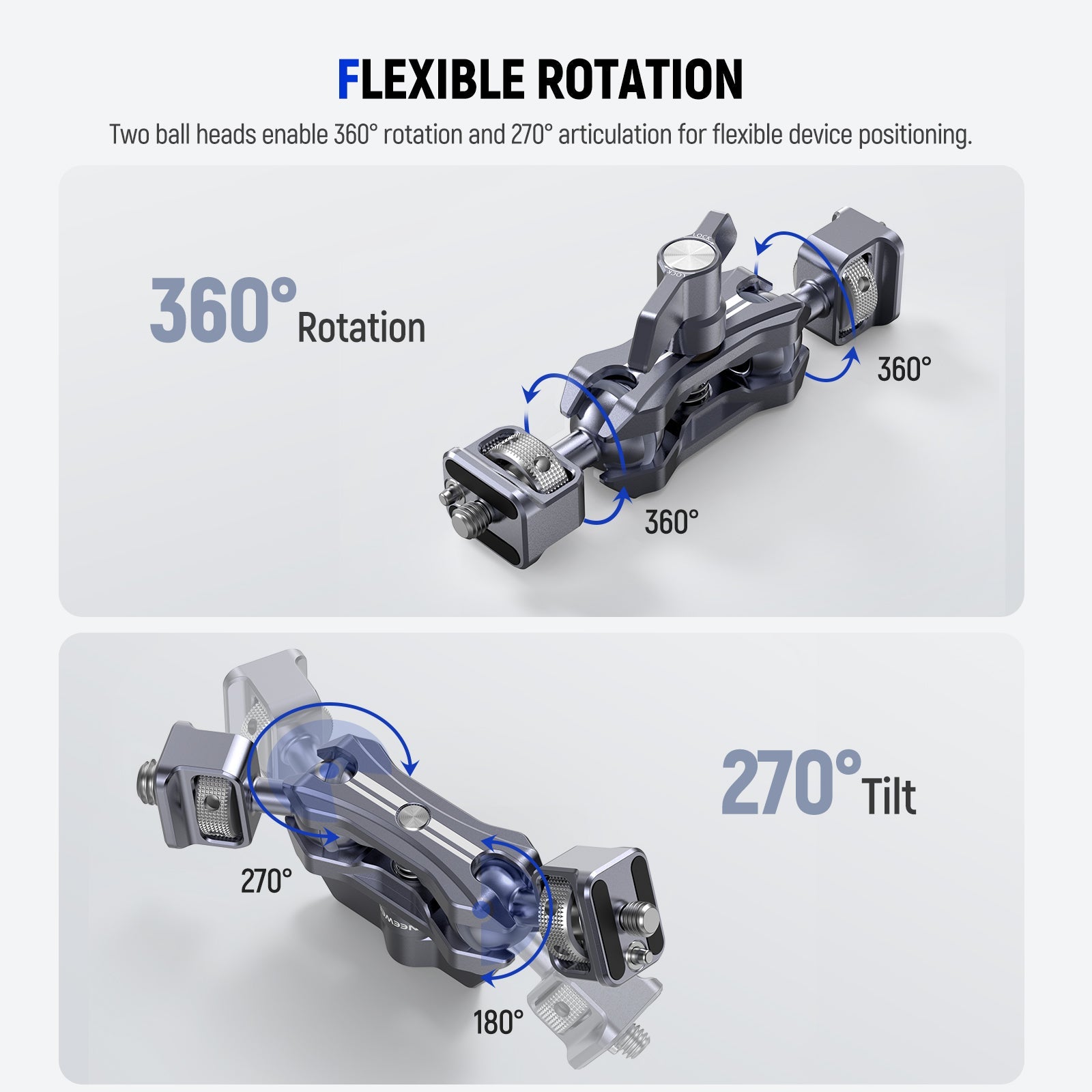 - Rotación de 360° e inclinación de 270° : este soporte de cámara con brazo mágico con dos cabezales de bola permite una rotación de 360° y una inclinación de 270° para un posicionamiento flexible. Los anillos de goma aumentan la fricción para mayor seguridad.