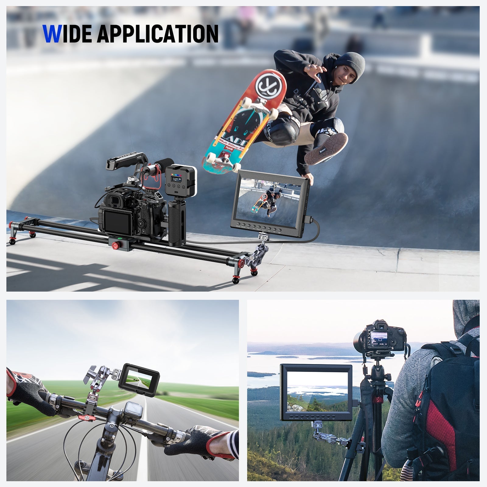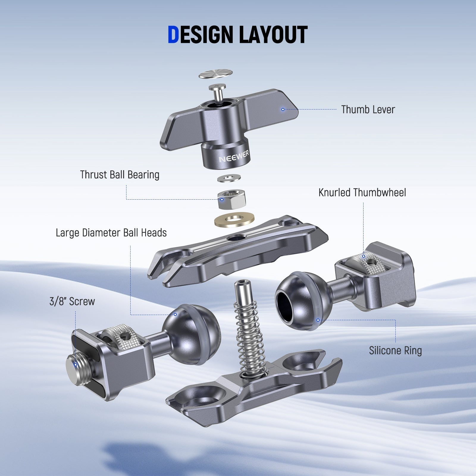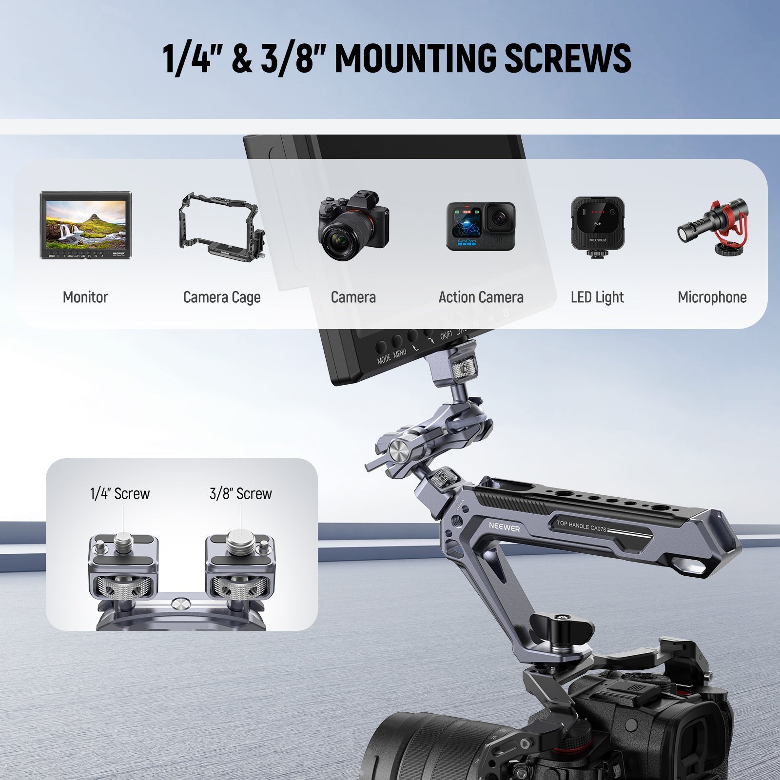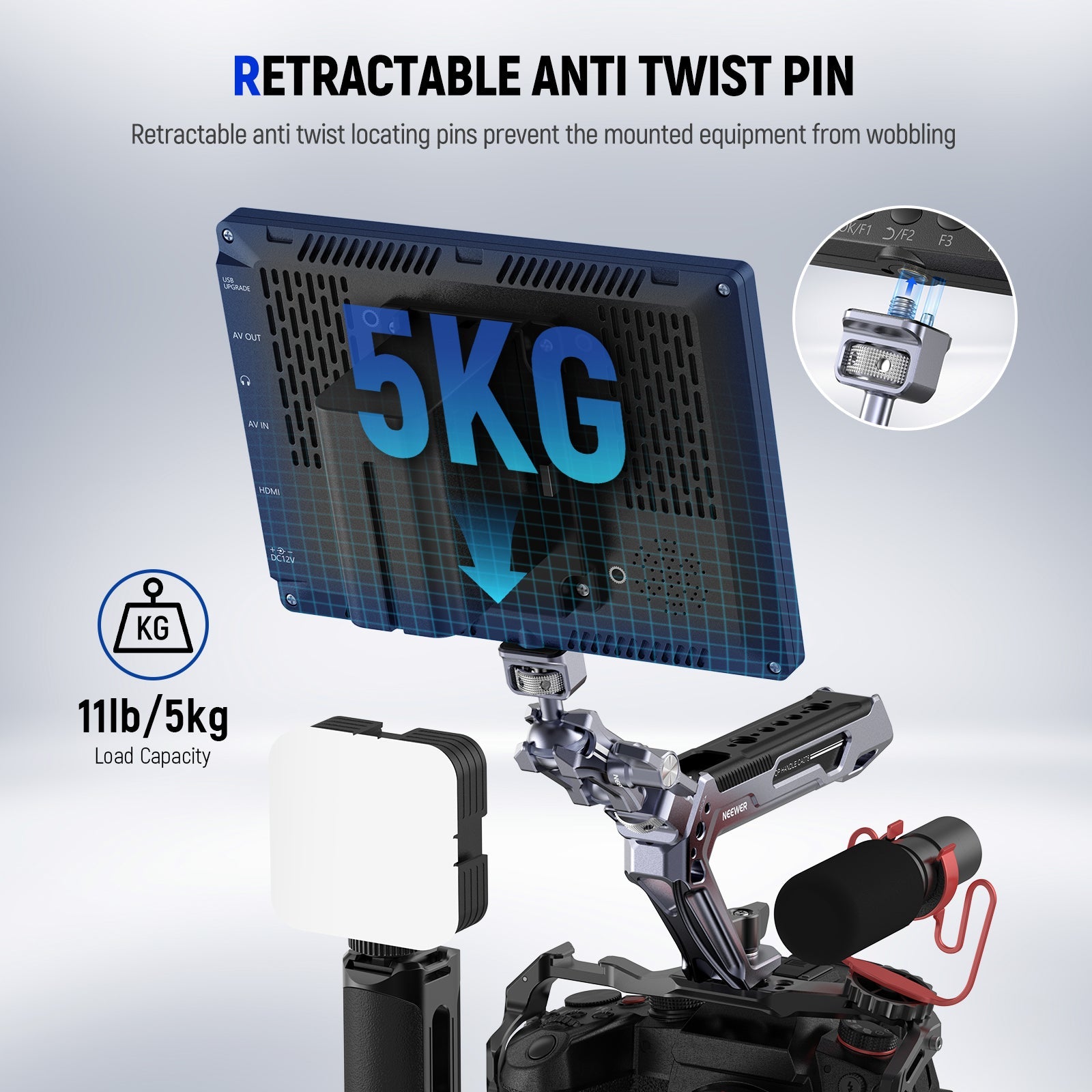 - Tornillos de montaje de 1/4" y 3/8": los tornillos de 1/4" y 3/8" son compatibles con una variedad de dispositivos de hasta 11 lb/5 kg, incluidos monitores de campo, luces de video LED, micrófonos, cámaras de acción y cámaras sin espejo. cámaras. También compatible con jaulas para cámaras SmallRig y NEEWER, plataformas de video y súper abrazaderas