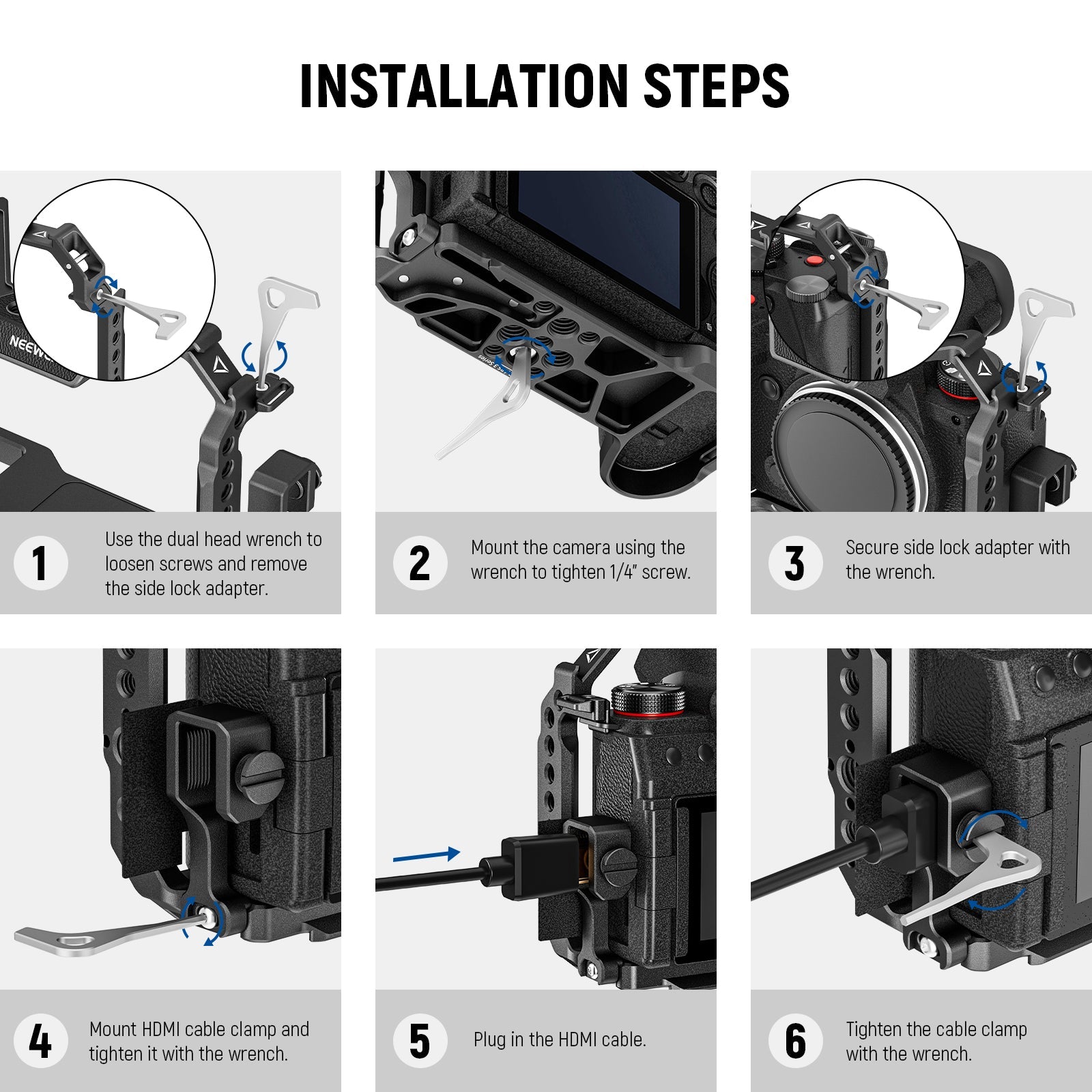 - Cerraduras triples antigiro : con un sistema de bloqueo triple, su cámara se sujetará de forma segura utilizando el tornillo de ubicación inferior de 1/4" y dos adaptadores de bloqueo laterales. Una llave de doble cabeza incluida se almacena magnéticamente debajo de la jaula para apretar los tornillos sin herramientas adicionales. sin esfuerzo