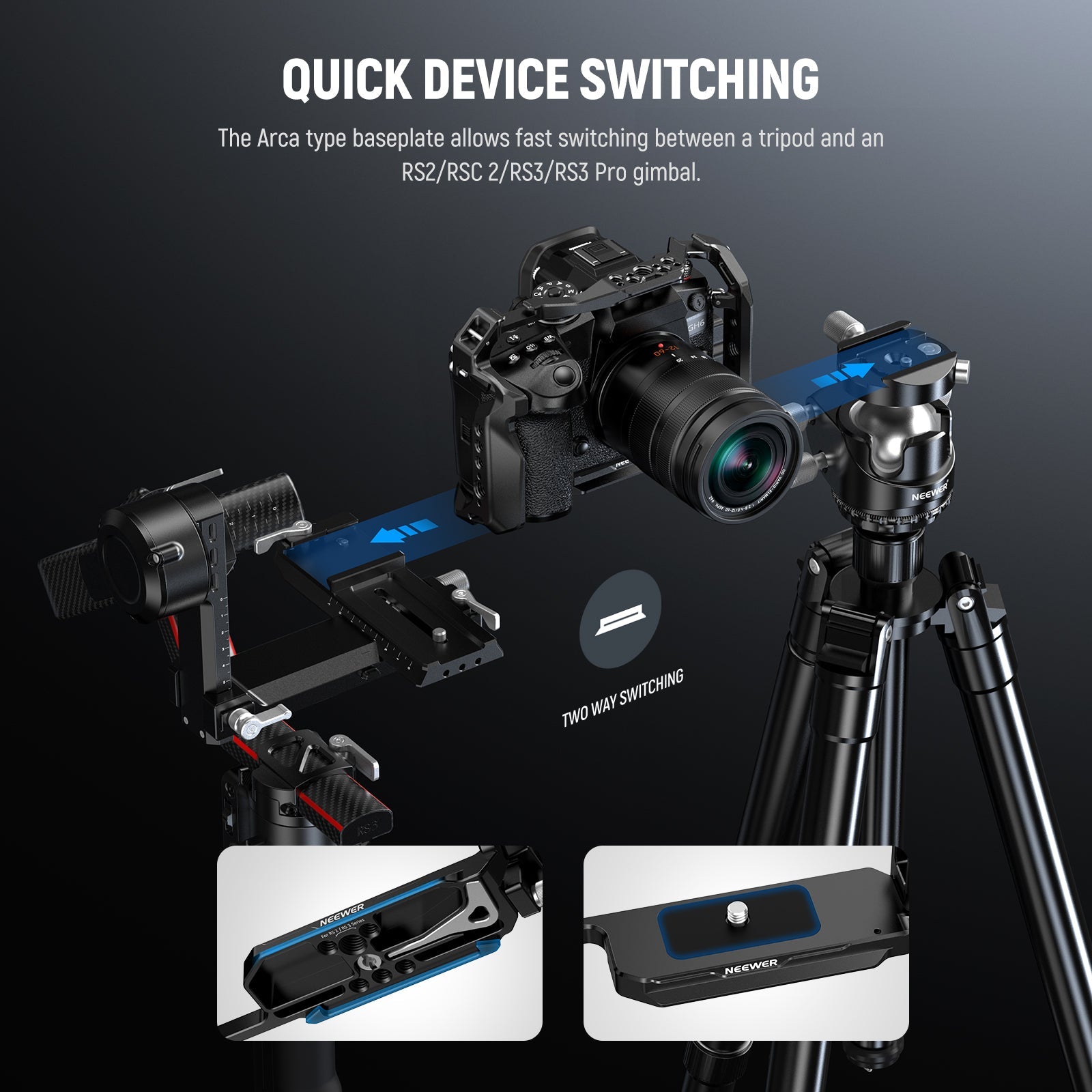 - Transferencias de equipo tipo Arca : La placa base de liberación rápida tipo Arca permite transferir rápidamente la cámara de un estabilizador de mano a un trípode, ya que es totalmente compatible con los estabilizadores DJI RS 2, RSC 2, RS 3, RS 3 Pro y la mayoría de las rótulas. Puede montar este soporte de vídeo para GH6 en un trípode tanto en orientación horizontal como vertical.