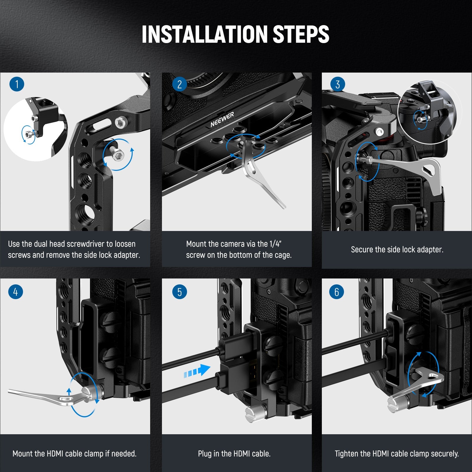 - Instalación firme y acceso completo : La jaula fija firmemente la cámara con un tornillo inferior de 1/4" y dos pasadores antigiro. Esta jaula ajustable garantiza acceso completo a los botones, puertos, pantalla LCD abatible y compartimento de la batería. Una almohadilla de goma antideslizante protege la cámara de arañazos.