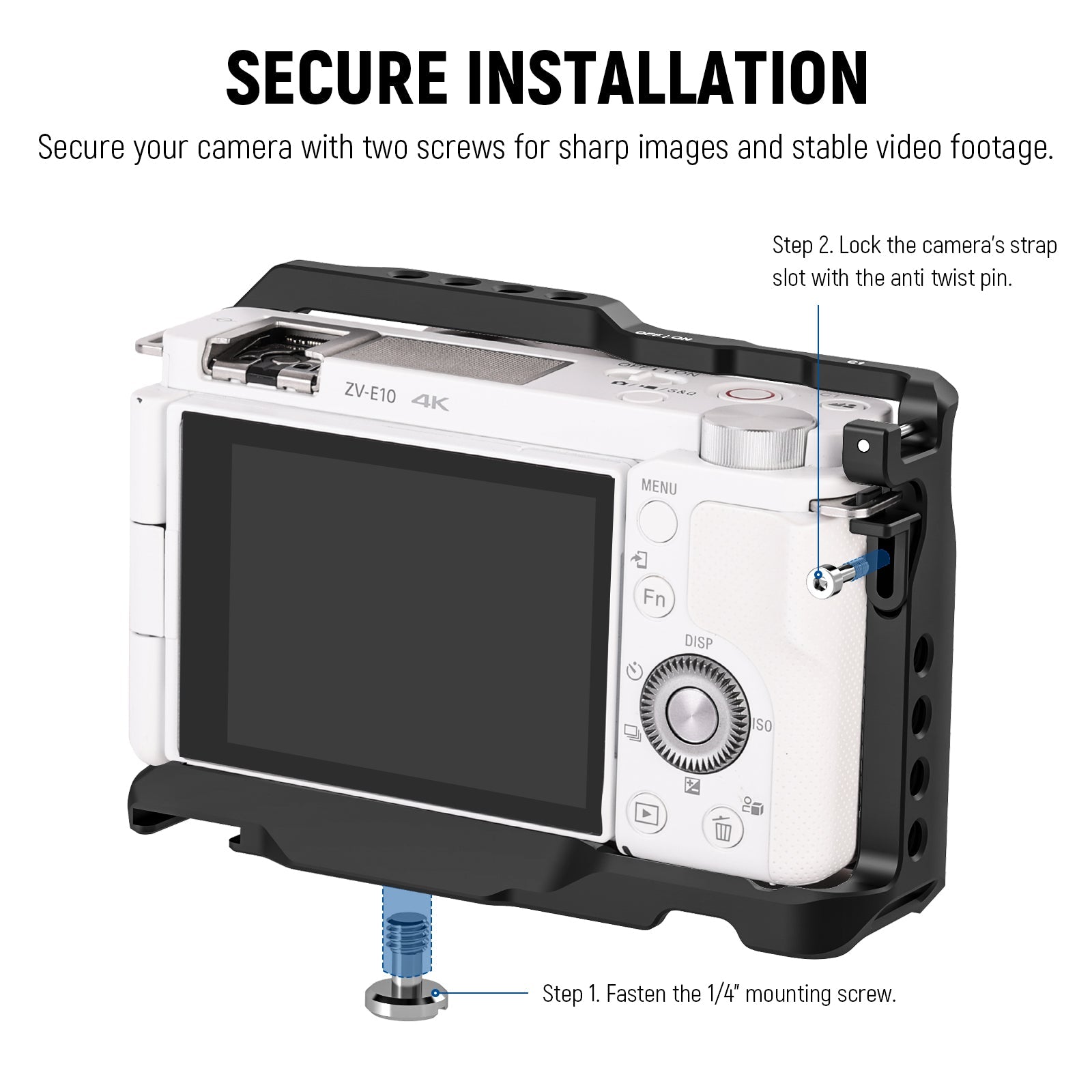 - Jaula para cámara ajustada : delgada y liviana, esta jaula para cámara es perfectamente compatible con la cámara Vlog sin espejo Sony ZV-E10 y al mismo tiempo conserva su portabilidad y tamaño compacto. El tornillo de montaje de 1/4” y el pasador antigiro fijan la cámara y evitan que se tambalee. Y un destornillador almacenado magnéticamente debajo de la jaula le ayuda a ajustar la tensión del tornillo con facilidad.
