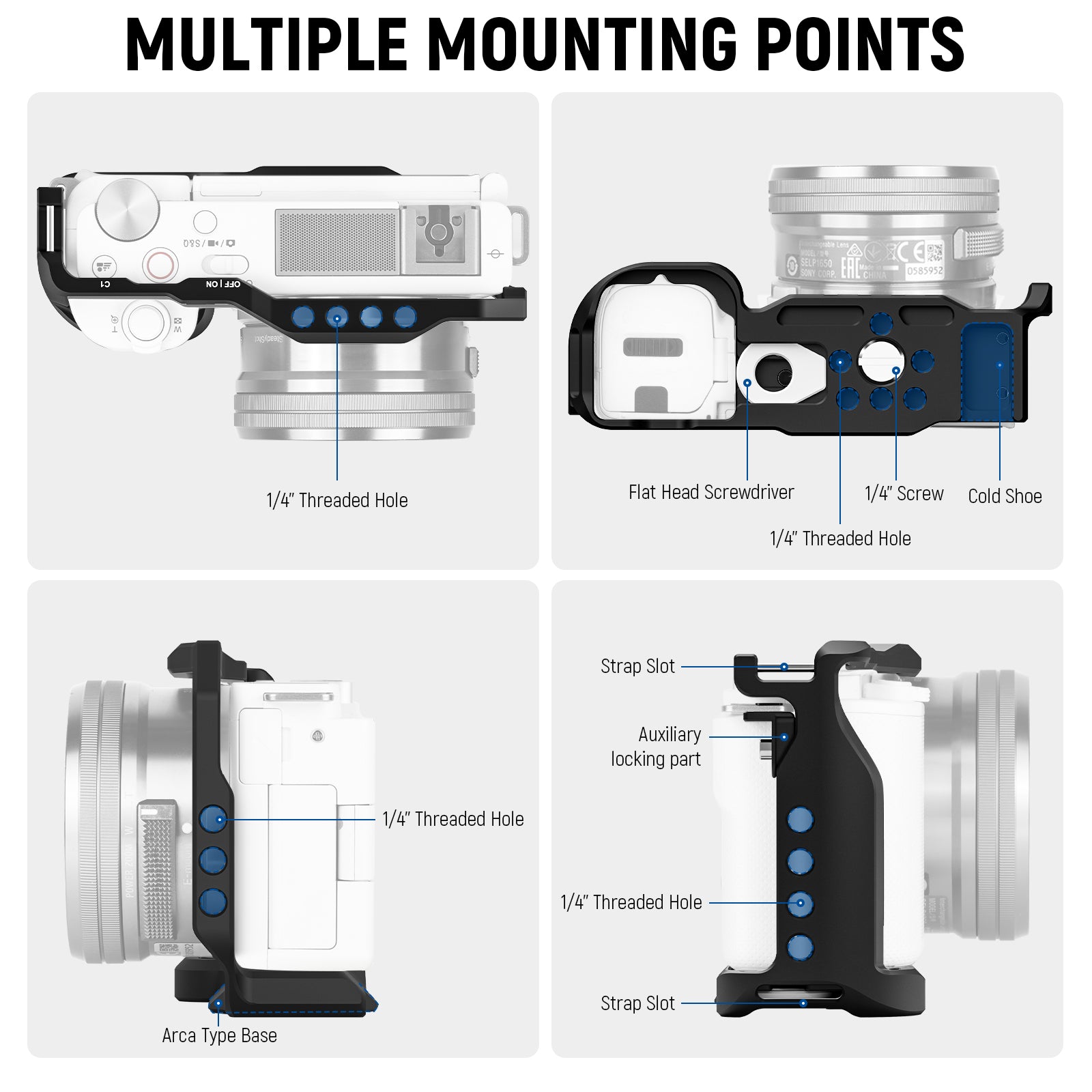 - Múltiples puntos de montaje : abundantes roscas hembra de 1/4” y un soporte de zapata fría maximizan sus opciones de expansión de accesorios. Por ejemplo, se pueden conectar a la jaula brazos mágicos, micrófonos pequeños y luces de video LED compactas para mejorar la calidad del video.