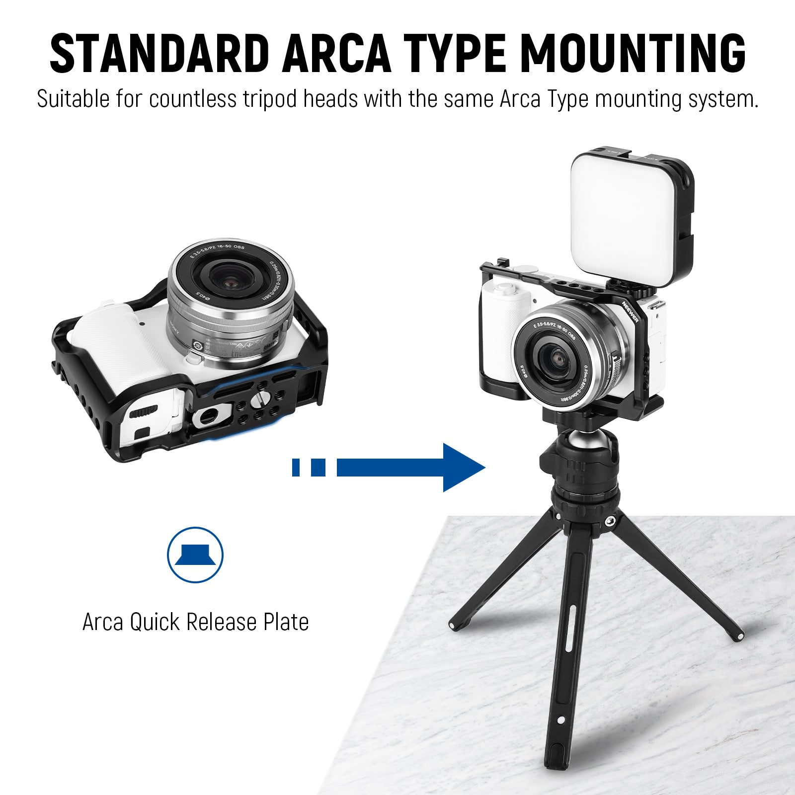 - Base de placa QR tipo Arca universal : con una base tipo Arca estándar, la jaula de la cámara se puede montar rápidamente en cualquier cabezal de trípode compatible con el sistema de montaje Arca Swiss.