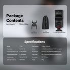 - Control de flash: Con un número guía de 38 (ISO 100), compatible con control manual (M) y óptico S1/S2. En modo M, ajuste fácilmente la intensidad del flash de 1/1 a 1/128 en incrementos de 1/8 de paso. Nota: No compatible con TTL, HSS ni con la función de configuración del menú de la cámara.