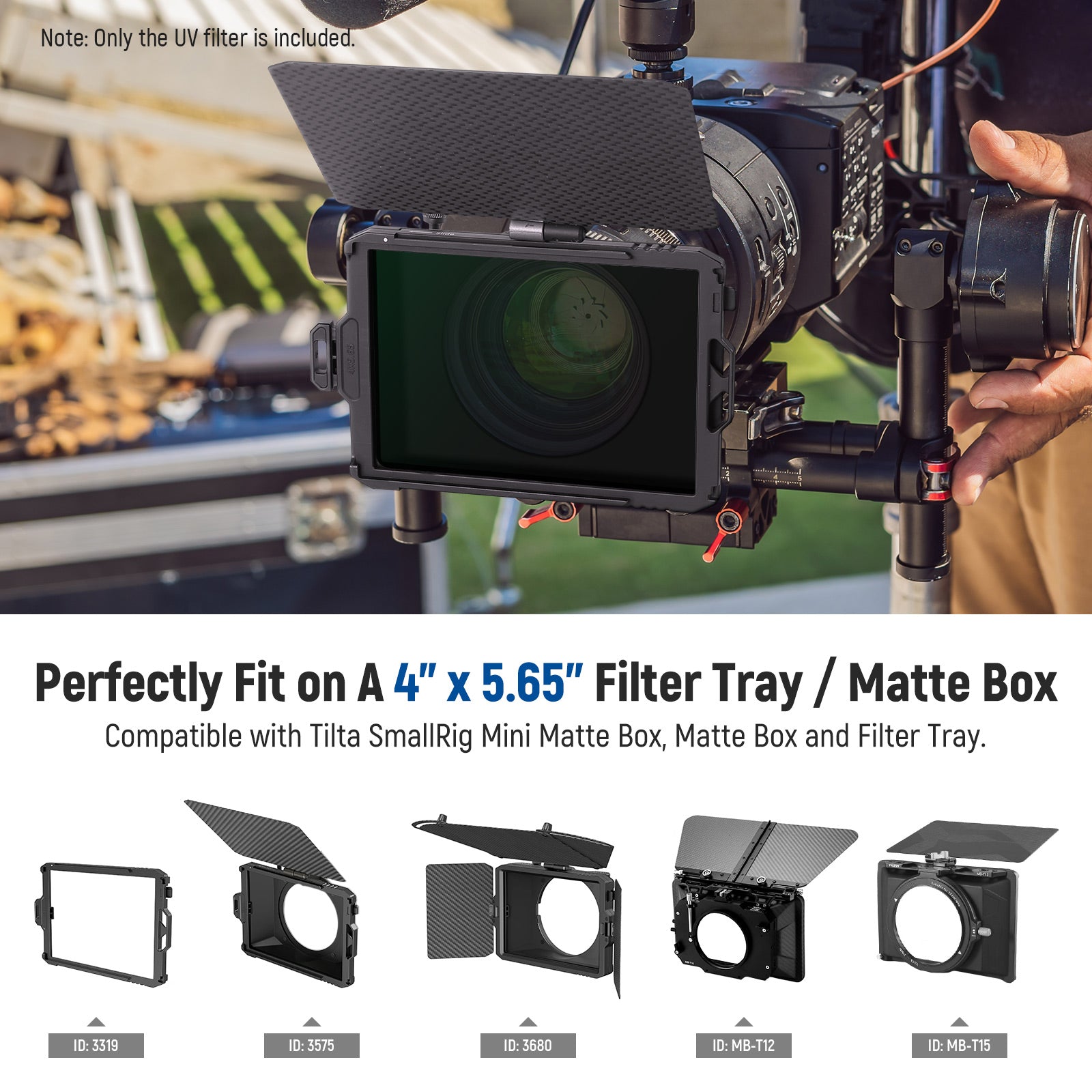 1. El filtro UV cuadrado no se puede atornillar directamente a la lente de la cámara. Debe montarse en una caja mate o en un marco de filtro para colocarlo frente a la lente de su cámara. Compatible con Tilta SmallRig Matte Box, Mini Matte Box y Filter Frame.