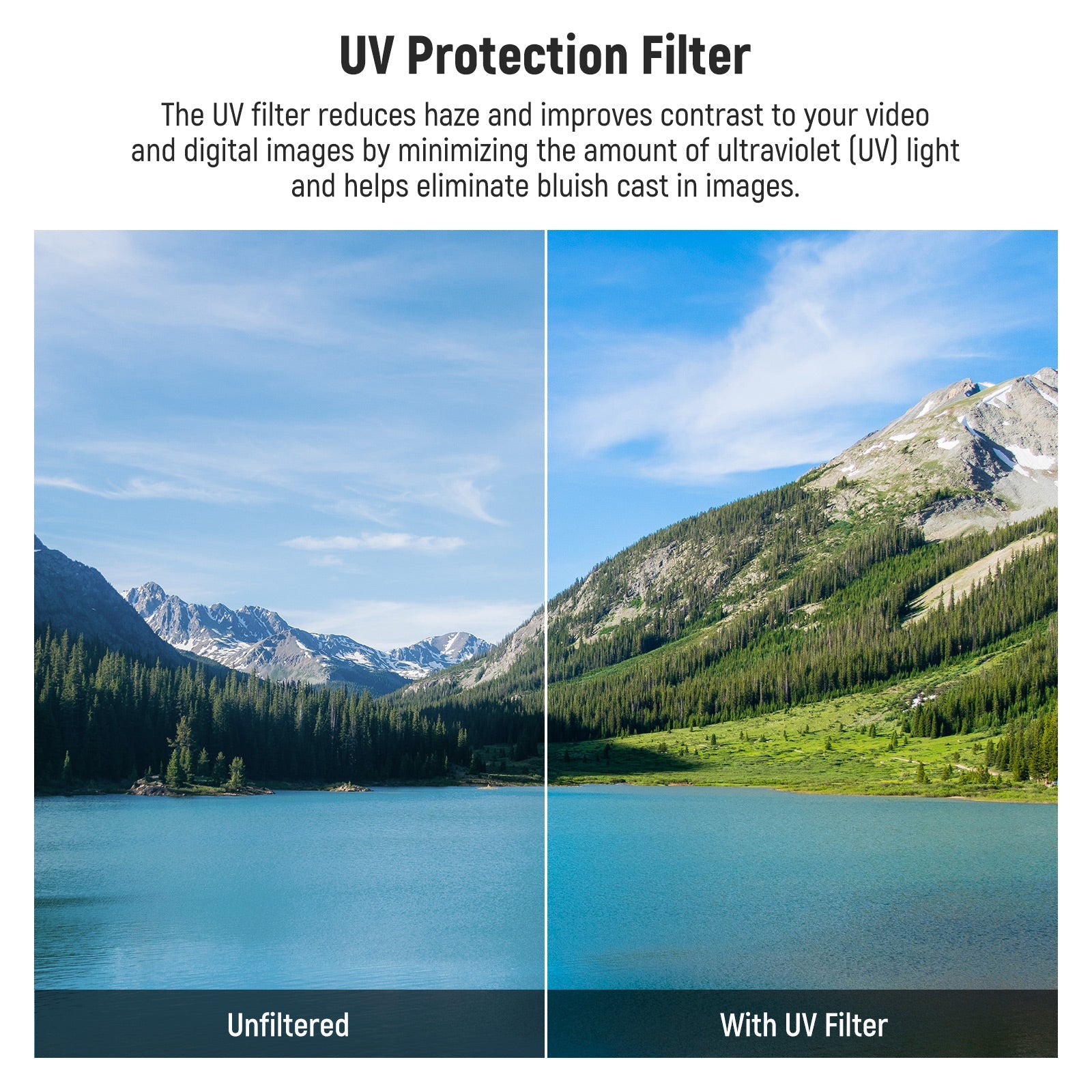 • Filtro UV protector : este filtro UV reduce la neblina y minimiza los rayos ultravioleta (UV) al tiempo que mejora el contraste. Perfecto para capturar fotografías de nieve y gran altitud sin el tono azulado. Mantenga este filtro en su lente para protegerlo contra el polvo, rayones y golpes.