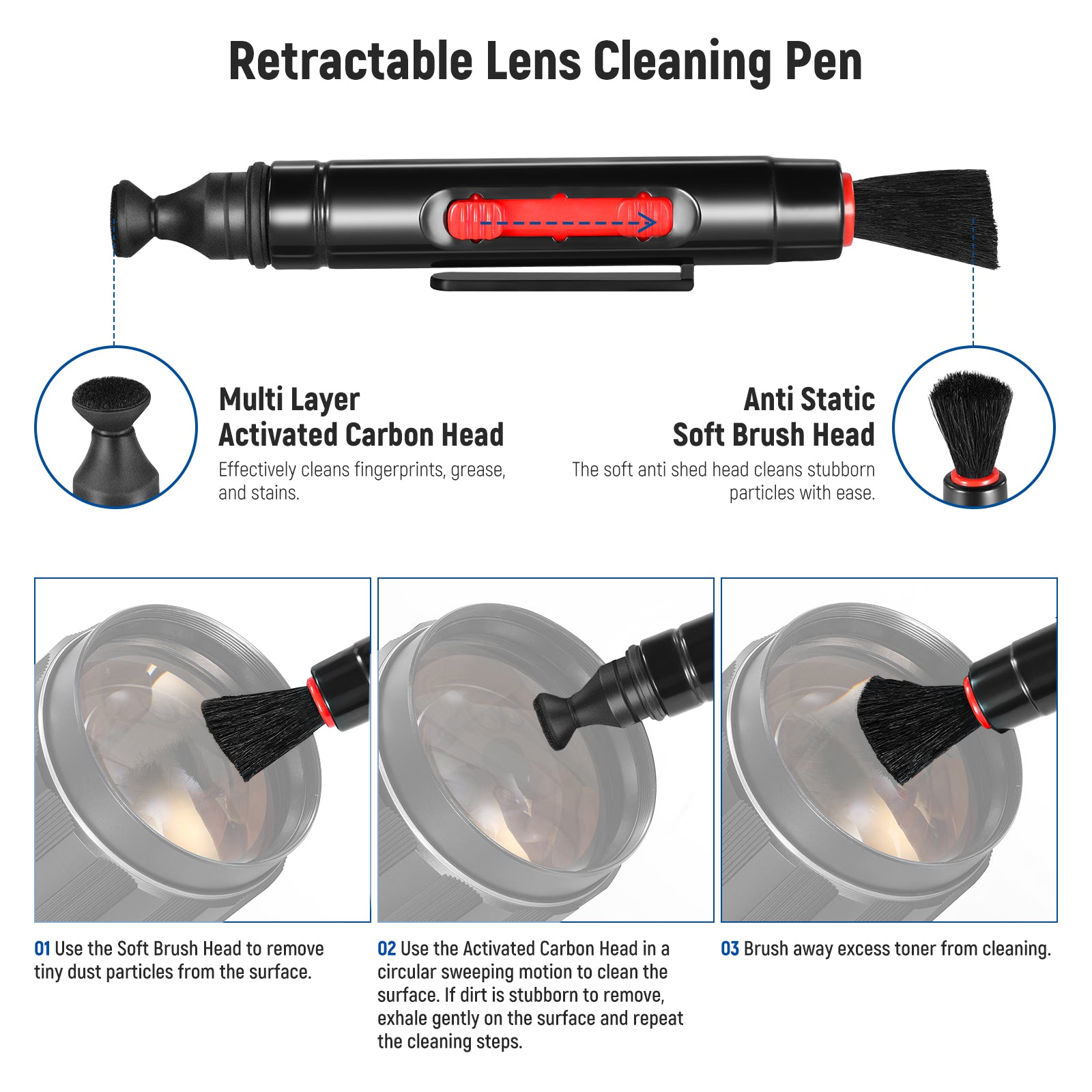 - Limpieza diaria sencilla : un bolígrafo de limpieza de lentes extensible y un paño de limpieza lo ayudan a eliminar fácilmente el polvo, los residuos, las huellas dactilares y las manchas de los filtros y lentes sin rayarlos.