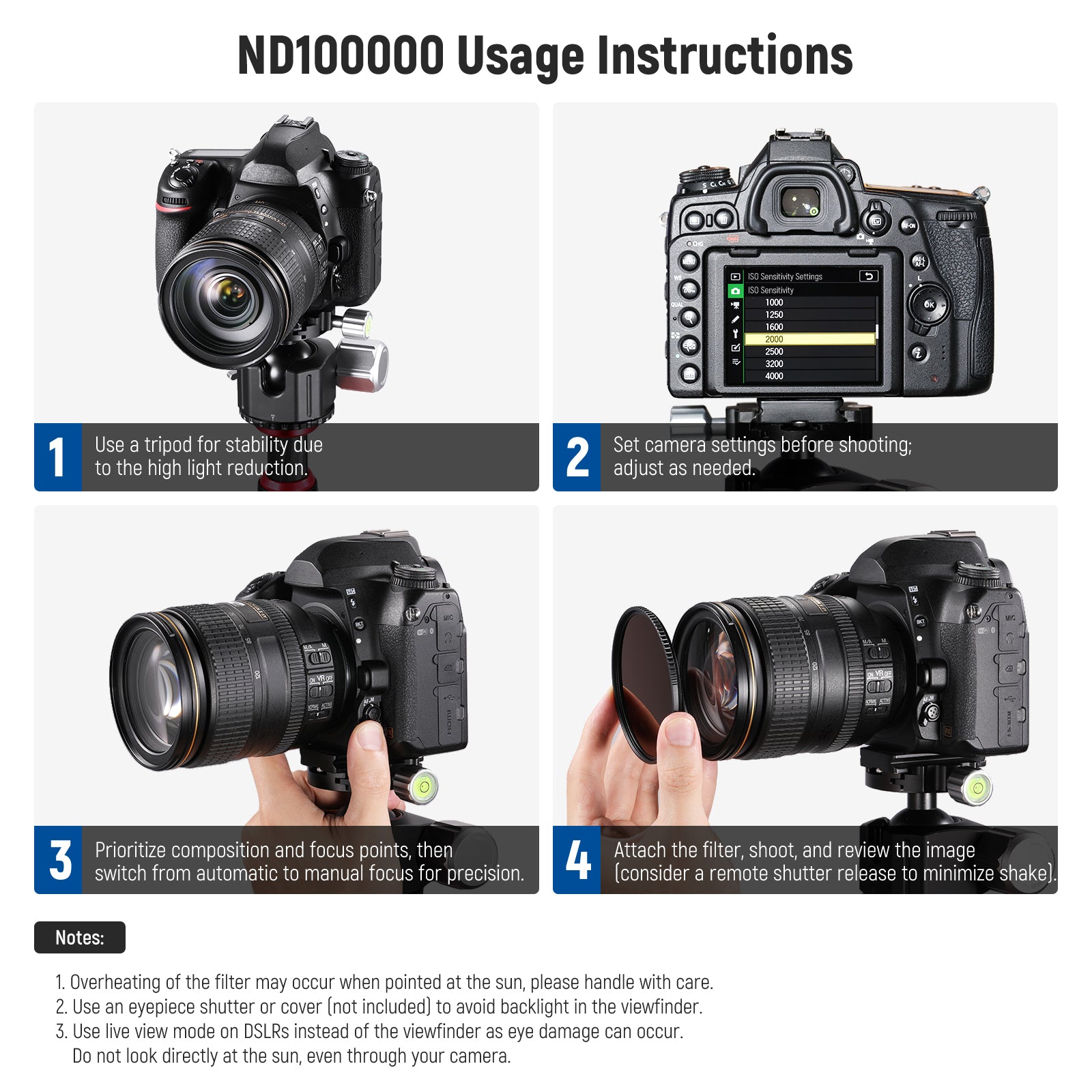 • Cómo usarlo correctamente : 1. Configure su composición y asegure la cámara en un trípode para evitar que se mueva y se vea borrosa. 2. Cambie al enfoque manual después de confirmar su punto de enfoque. 3. Conecte el filtro ND y utilice un cable disparador para obtener mejores resultados. 4. Revise la imagen y ajuste la apertura, ISO y velocidad de obturación para lograr el efecto deseado. Aumente el valor F para una velocidad de obturación más lenta o aumente el ISO para una velocidad de obturación más rápida