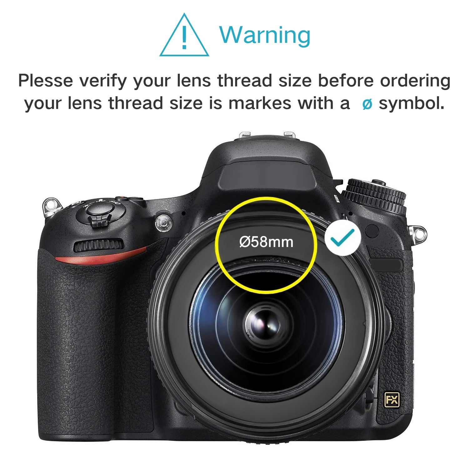 Nota: Este kit es compatible con todos los lentes de 58 mm. Verifique el tamaño de la rosca de la lente de su cámara antes de realizar el pedido. El tamaño de la rosca del objetivo de su cámara estará marcado en algún lugar del cilindro del objetivo o impreso debajo de la tapa del objetivo. Este número siempre va precedido del símbolo " Φ " (diámetro). Por ejemplo: " Φ " 58 = tamaño de rosca de lente de 58 mm.
