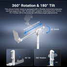 - 360° Rotation & 180° Tilt- This phone holder stand is equipped with a flexible horizontal extension rod that supports a 180° tilt and 360° rotation, extending from 15.4 to 19.7 inches (39 to 54.4 cm) for effortless angle adjustments. This design allows for quick switching between landscape and portrait modes, ensuring optimal positioning for watching videos, following recipes while cooking, or participating in video calls