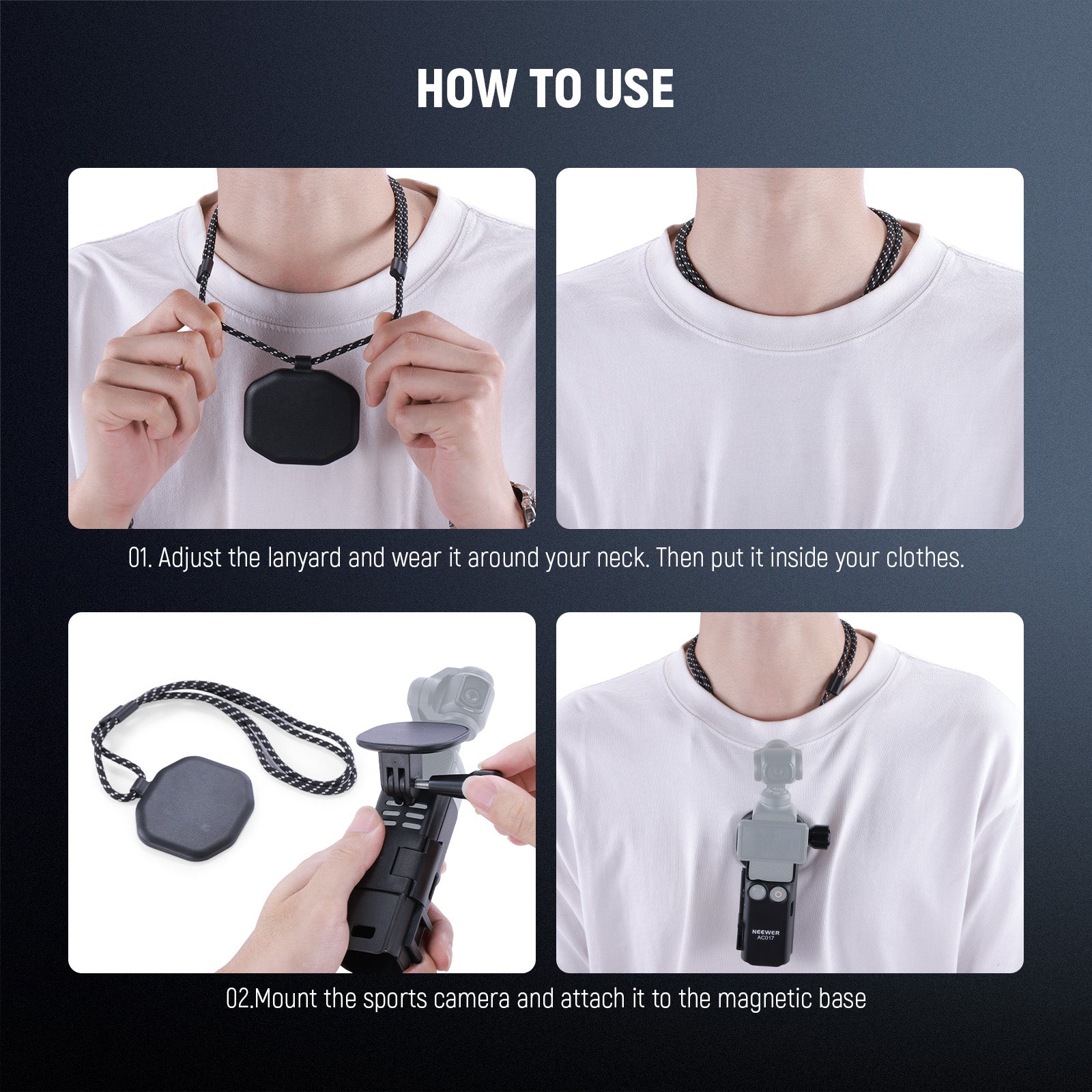 - Accesorio magnético de liberación rápida : El soporte para el cuello cuenta con un adaptador magnético que se conecta al soporte mediante un accesorio magnético y se fija a la jaula de la cámara mediante el perno en T. Los potentes imanes integrados garantizan una sujeción estable para su Pocket 3, proporcionando un soporte firme para grabar vídeos fluidos durante caminatas, senderismo o acampadas. El sistema magnético facilita la instalación y la liberación rápida, mientras que los ángulos de inclinación ajustables permiten perspectivas de disparo versátiles.