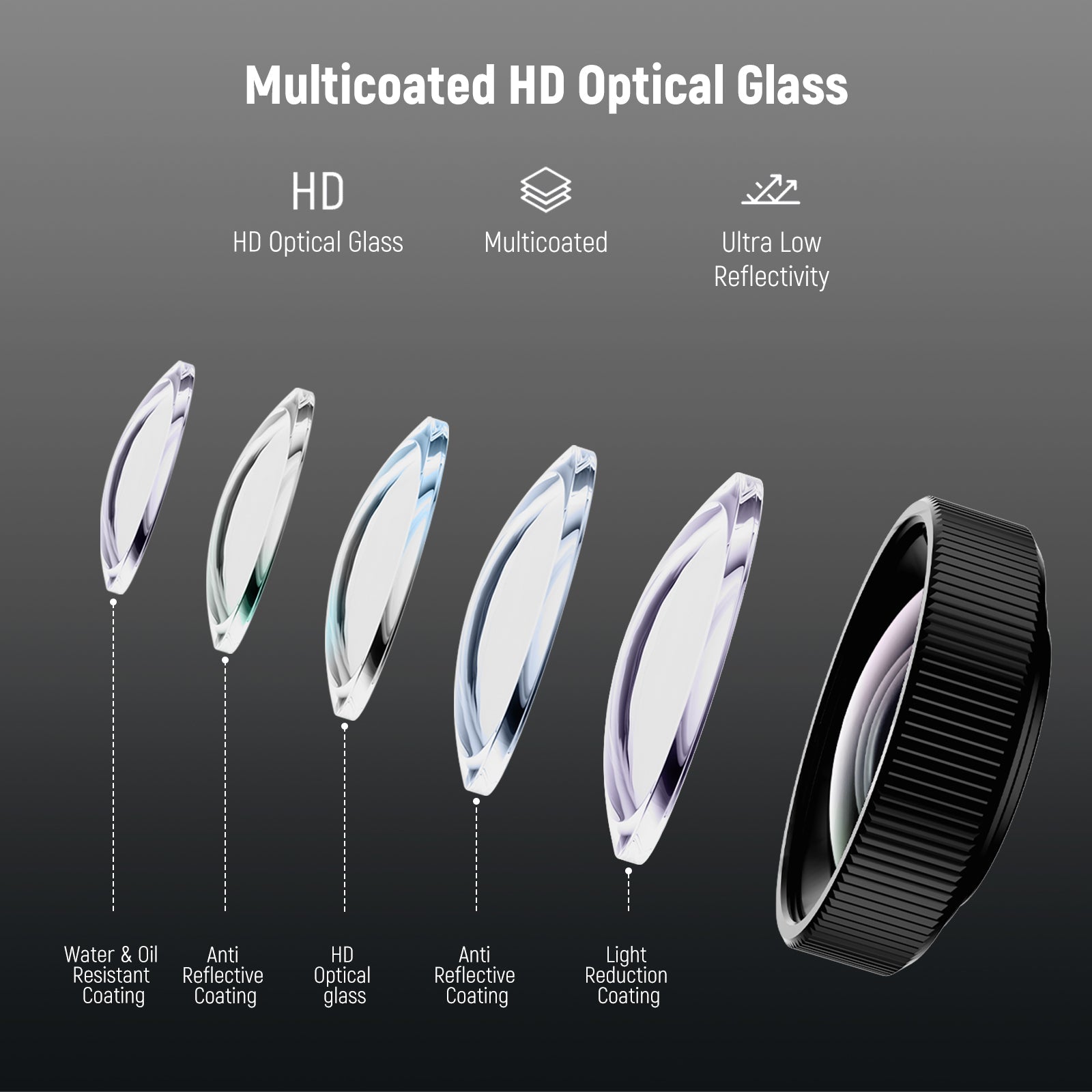 - Vidrio óptico HD multicapa : El vidrio óptico HD con 2 elementos en un solo grupo garantiza una alta claridad. Múltiples capas protectoras de baja reflectancia reducen eficazmente el deslumbramiento y las imágenes superpuestas, a la vez que protegen contra manchas y huellas dactilares.