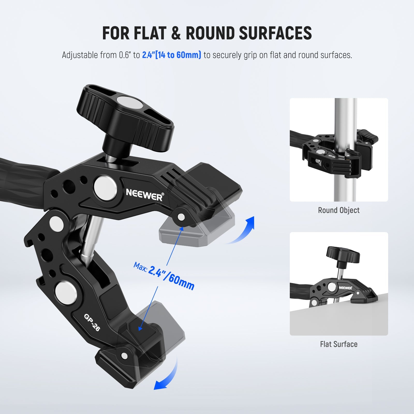 - Para superficies planas y redondas : la súper abrazadera con una abertura de mordaza de 0,6"-2,4"/14-60 mm puede sujetarse en superficies planas y cilíndricas, como escritorios, mesas, patas de trípode, palos para selfies, soportes de luz, manillares de bicicleta, bastones, y cuenta con almohadillas de goma antideslizantes para protección contra rayones. Compatible con DJI Ronin-M Ronin MX; compatible con varillas estabilizadoras de cardán Freefly Movi de 25 mm y 30 mm. El adaptador incluido es compatible con cámaras de acción GoPro Insta360