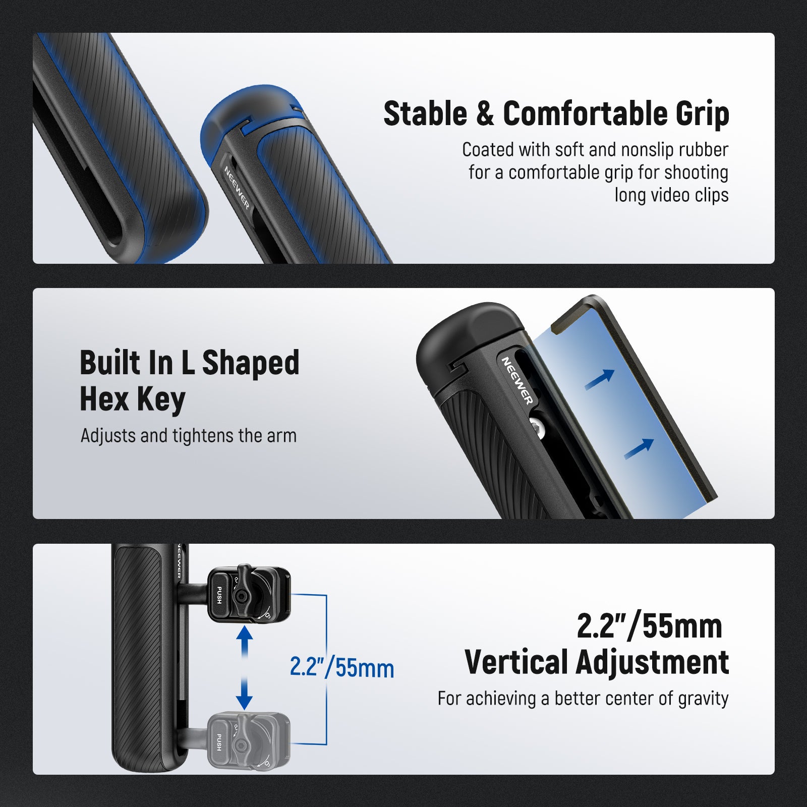 - Agarre estable y cómodo : recubierto con goma suave y antideslizante, el mango lateral de liberación rápida proporciona un agarre cómodo y firme para grabar videos estables y prolongados.