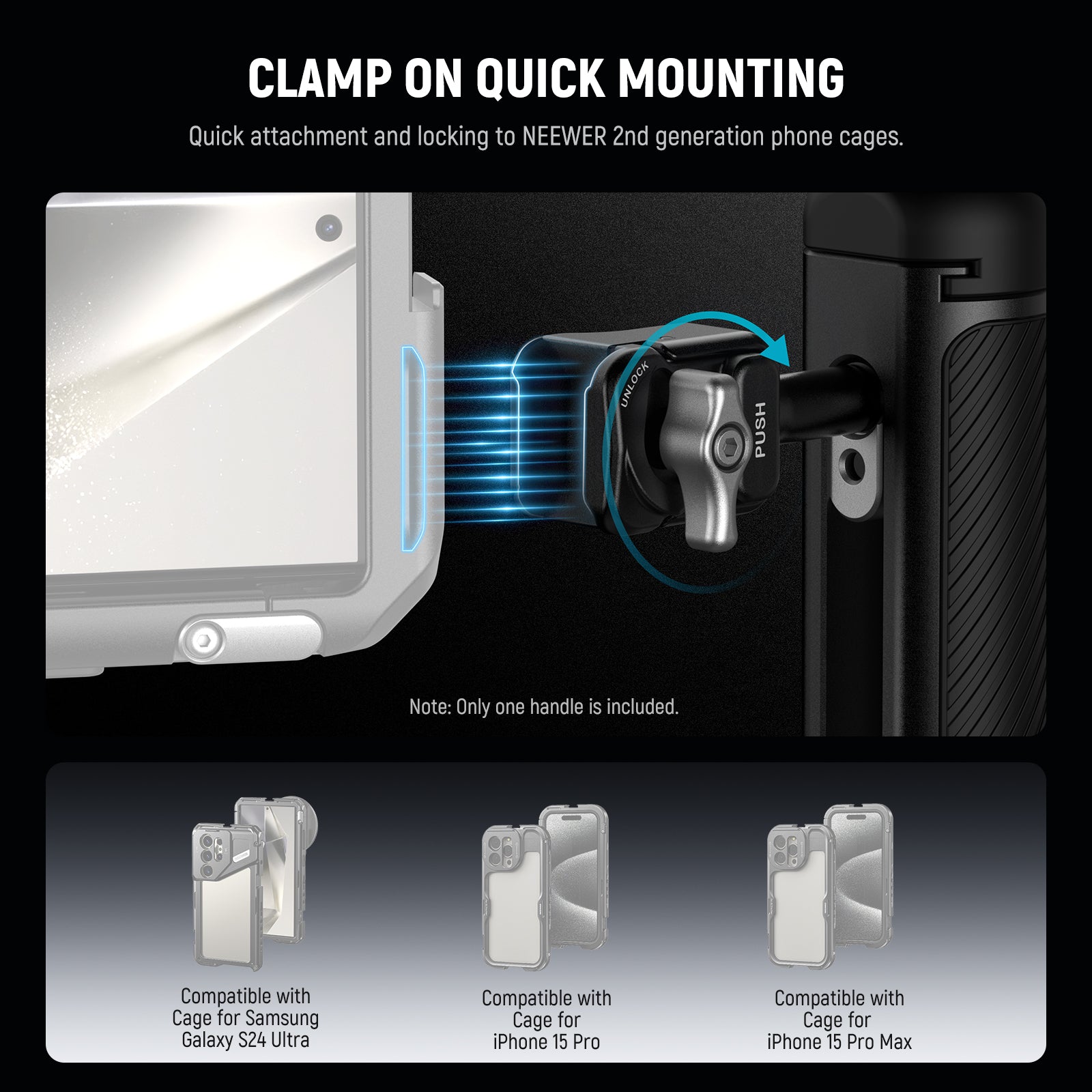 - Instalación de abrazadera de liberación rápida : con una abrazadera de liberación rápida, el mango lateral se puede conectar rápidamente a la carcasa del teléfono y asegurarse con un giro de la perilla de bloqueo, perfecto para grabación de videos al aire libre, realización de películas, vlogs, transmisión en vivo, fotografía móvil y otras actividades donde el tiempo es un bien escaso