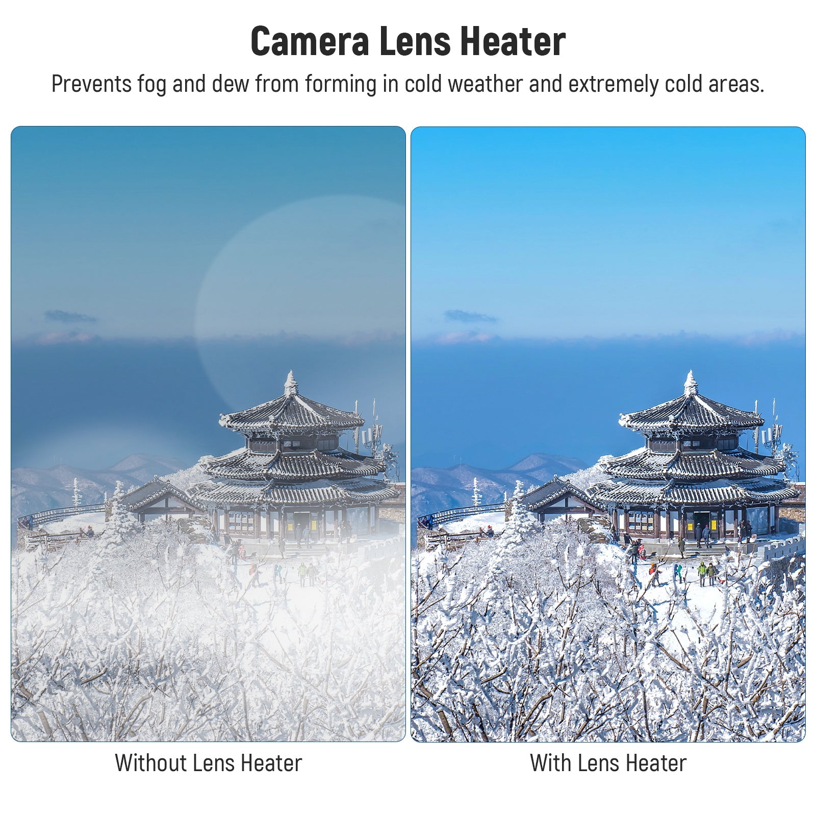 - Calentamiento mejorado con tecnología FPC : diseñado con FPC (circuitos impresos flexibles), este calentador de lentes liviano pero duradero utiliza películas de poliimida como aislante para un rendimiento dieléctrico confiable y termolámina como elemento calefactor para mejorar la conductividad térmica y una mayor eficiencia de transferencia de calor para acelerar y calienta uniformemente tu lente. Nota: El calentador de lentes se puede doblar pero no se puede plegar.