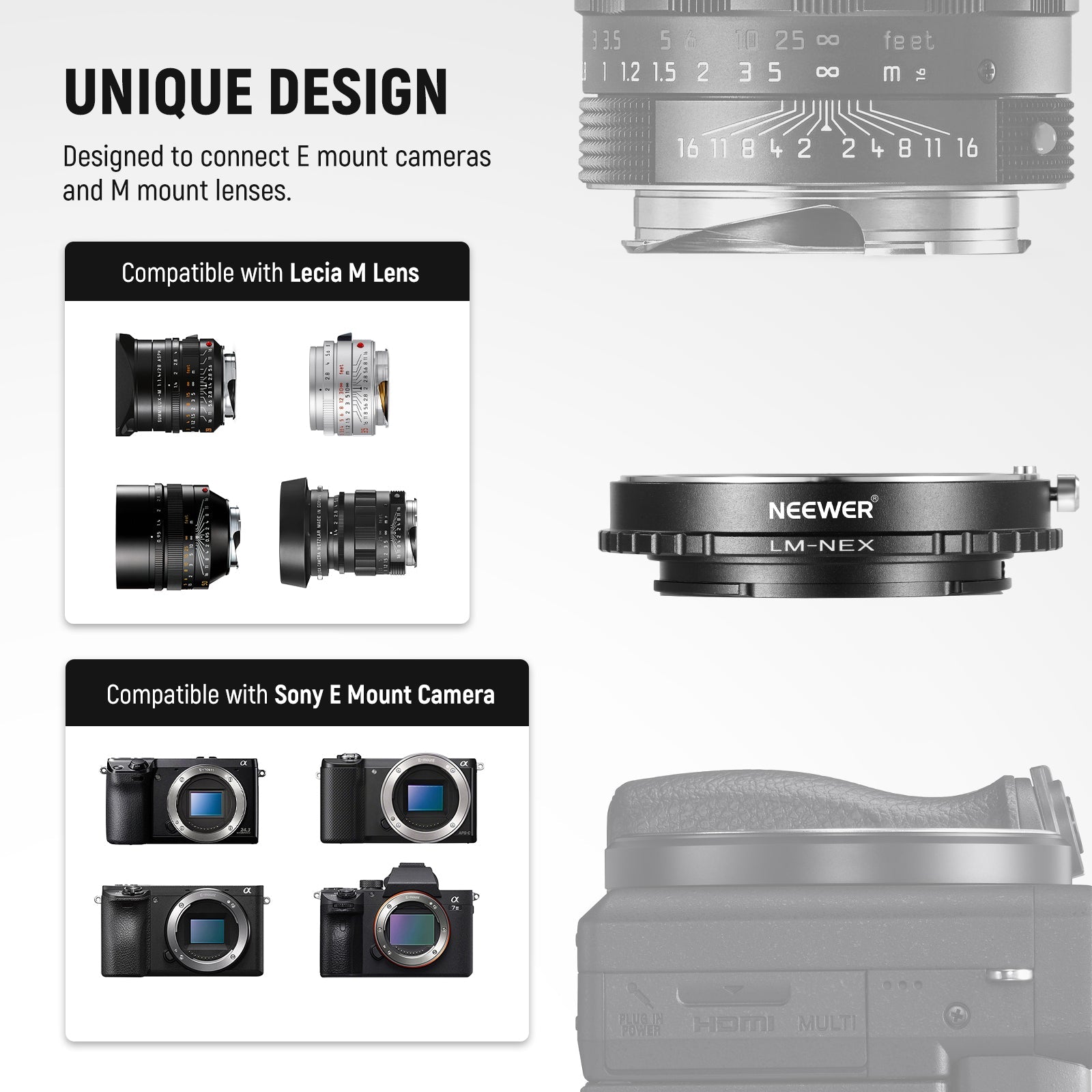 - Amplia compatibilidad : compatible con cámaras Sony de las series Alpha y NEX con montura E (incluidas A1 A9 A7 A7C A7R A7S A6600 A6400 A5000 NEX-7 NEX-6 NEX-5 NEX-3 ZV-E10 FX30) y compatible con lentes con montura Leica M, esta El adaptador de lentes le permite conectar una lente con montura M a una cámara con montura E para una creación extraordinaria.