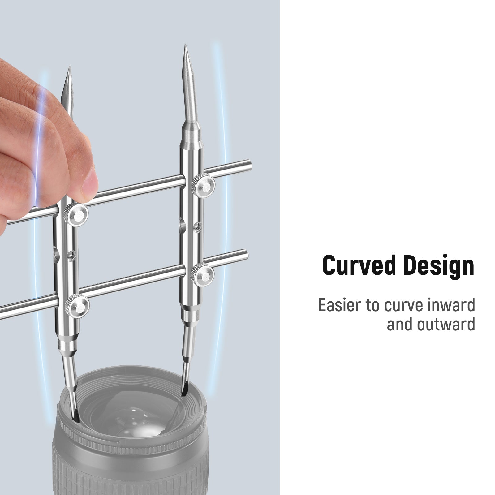 - Punta curva con apertura ajustable : La punta curva se adapta perfectamente a lentes convexas con anillo de retención curvo o inclinado. Su diseño curvo permite que la llave no solo cure hacia afuera, sino también hacia adentro. Los brazos se pueden ajustar para que la distancia entre las dos puntas se adapte a lentes de 5 mm a 110 mm de diámetro.