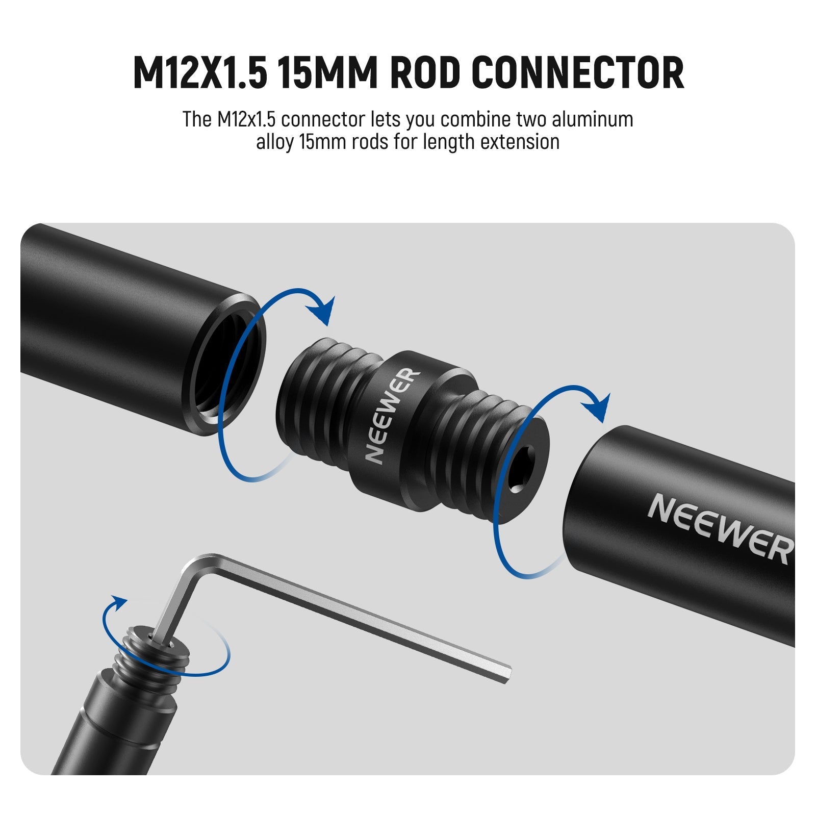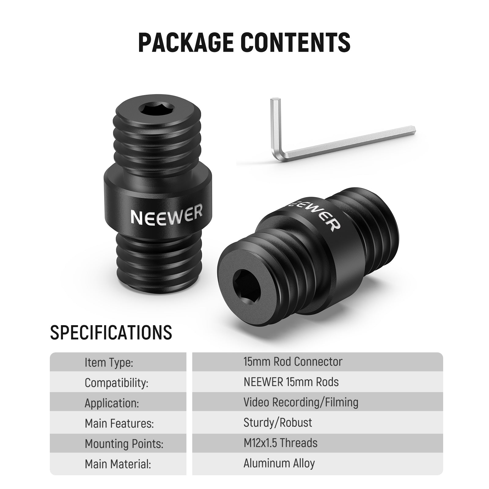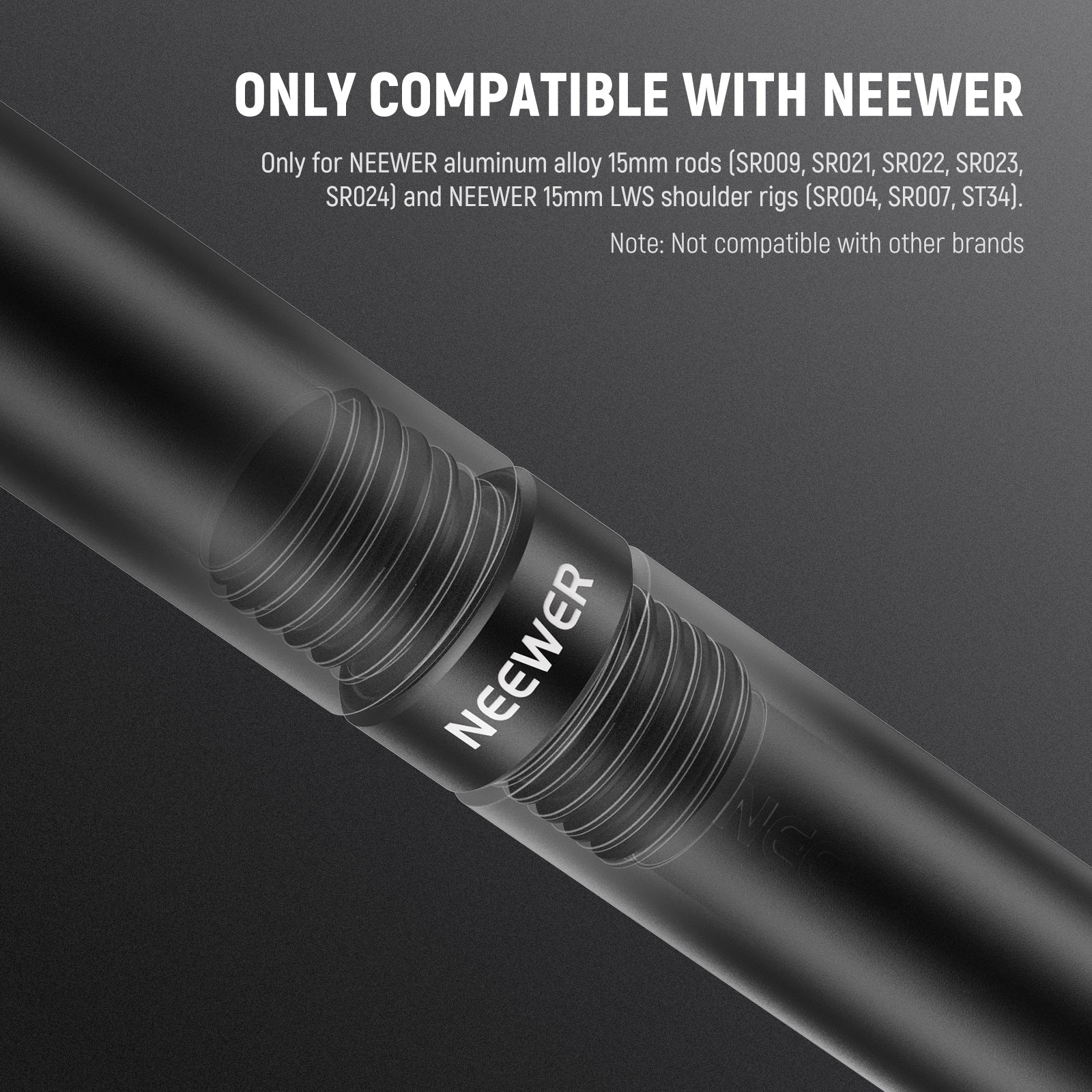 - Compatible únicamente con NEEWER : solo para cañas de aleación de aluminio de 15 mm de NEEWER (SR009, SR021, SR022, SR023, SR024) y aparejos de hombro LWS de 15 mm de NEEWER (SR004, SR007, ST34). No compatible con otras marcas
