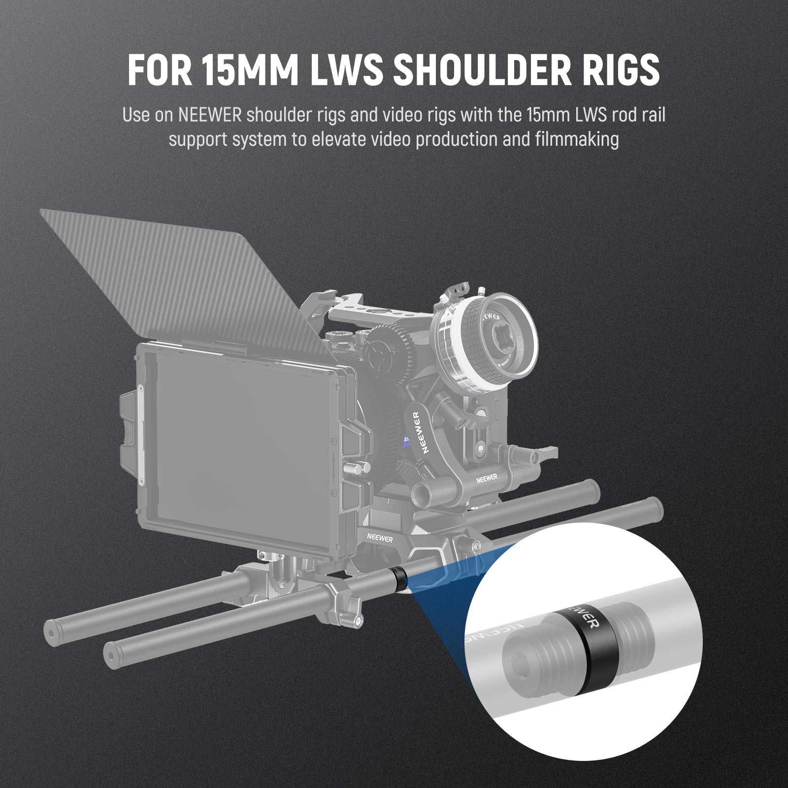 - Para plataformas de hombro LWS de 15 mm : utilícelo en plataformas de hombro y plataformas de video NEEWER con el sistema de soporte de riel de varilla LWS de 15 mm para mejorar la producción de videos y la realización de películas.