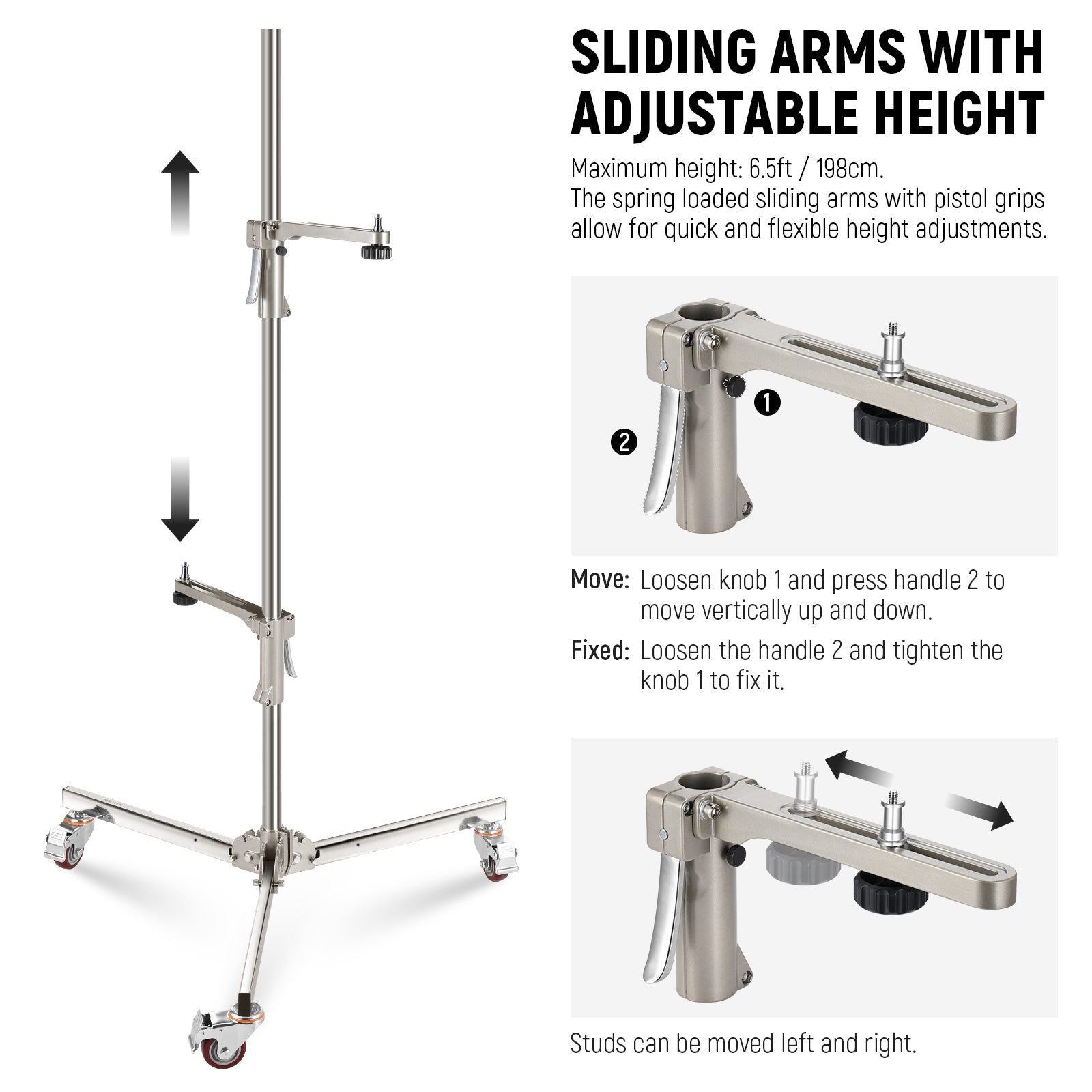 - Brazos deslizantes con altura ajustable : este soporte de iluminación tiene una altura máxima de 198 cm/6,5 pies y satisface diversas necesidades fotográficas. Los brazos deslizantes con resorte y empuñaduras de pistola permiten ajustes de altura rápidos y flexibles, lo que permite el movimiento vertical hacia arriba y hacia abajo. Suelte el gatillo de resorte para asegurar y apretar la perilla para mayor estabilidad y seguridad.
