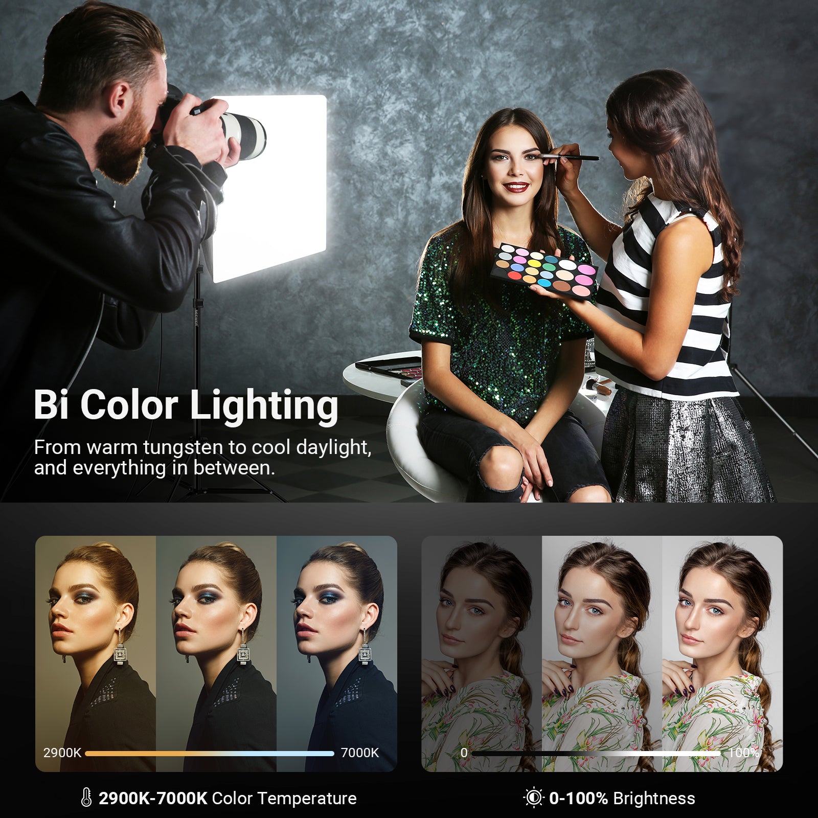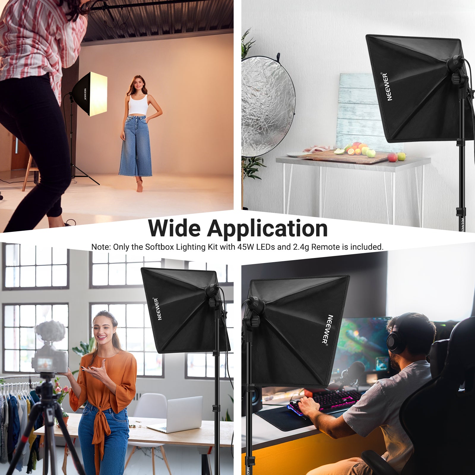 • Comprehensive Studio Lighting Kit- Includes 2 24"x24" square softboxes, 2 bi color LED bulbs, 2 adjustable light stands, a 2.4G remote control, and a carrying bag, bringing you a professional lighting setup for live streaming, portrait & product photography, photo art, and many other creative endeavors