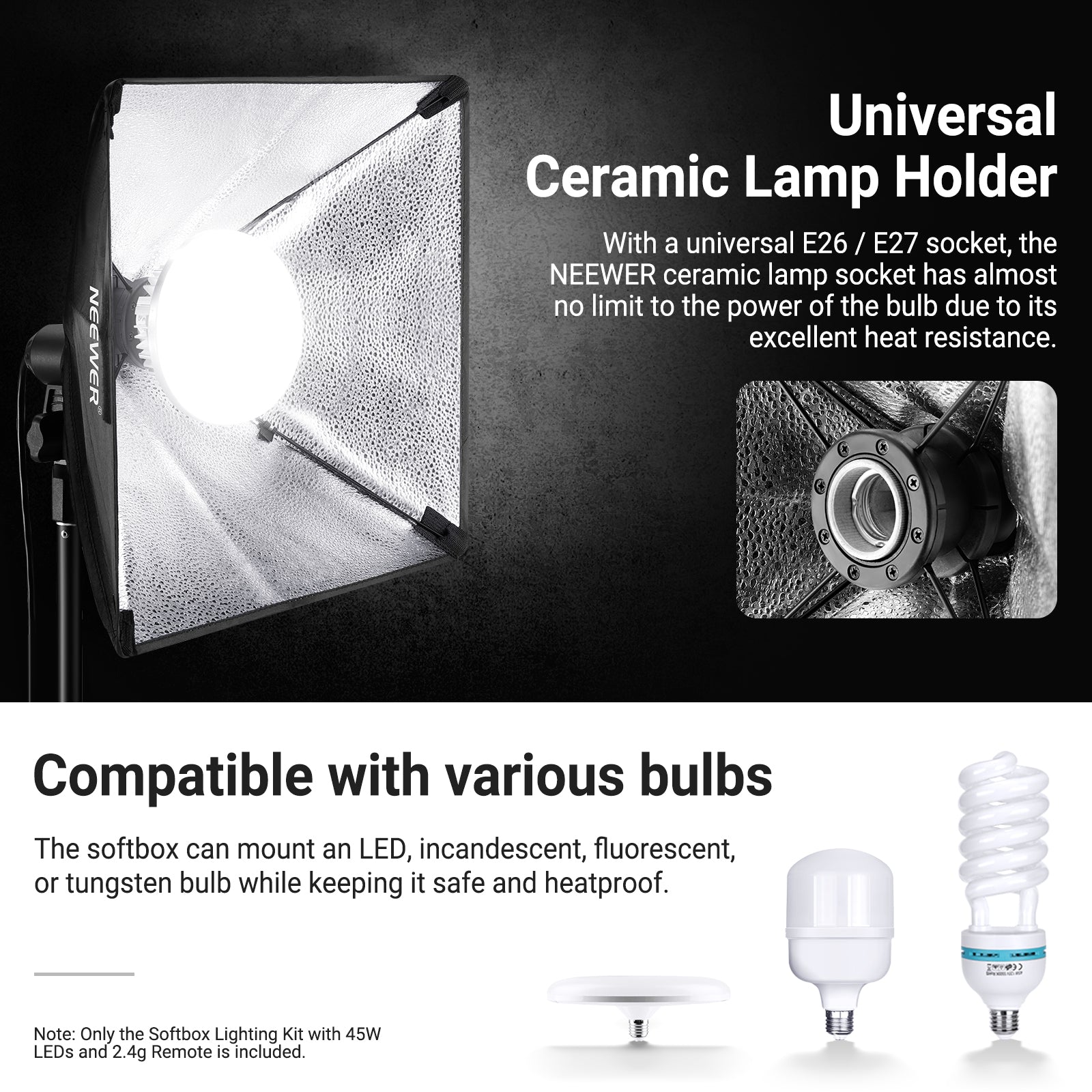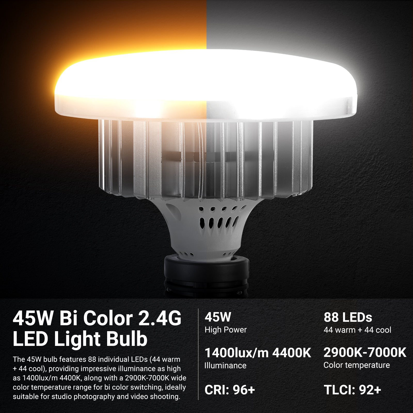 • 45W Bi Color 2.4G LED Light Bulb- The 45W bulb features 88 LEDs (44 warm + 44 cool LEDS), providing impressive illuminance as high as 1400lux/m 4400K, along with a 2700K-7000K wide color temperature range for bi color switching, ideally suitable for studio photography and video shooting. Use the included 2.4G remote to control the 2 bulbs independently within 66'/20m, each of which can be set to 10 channels. The remote can be set to Channel 88 to control all the channels