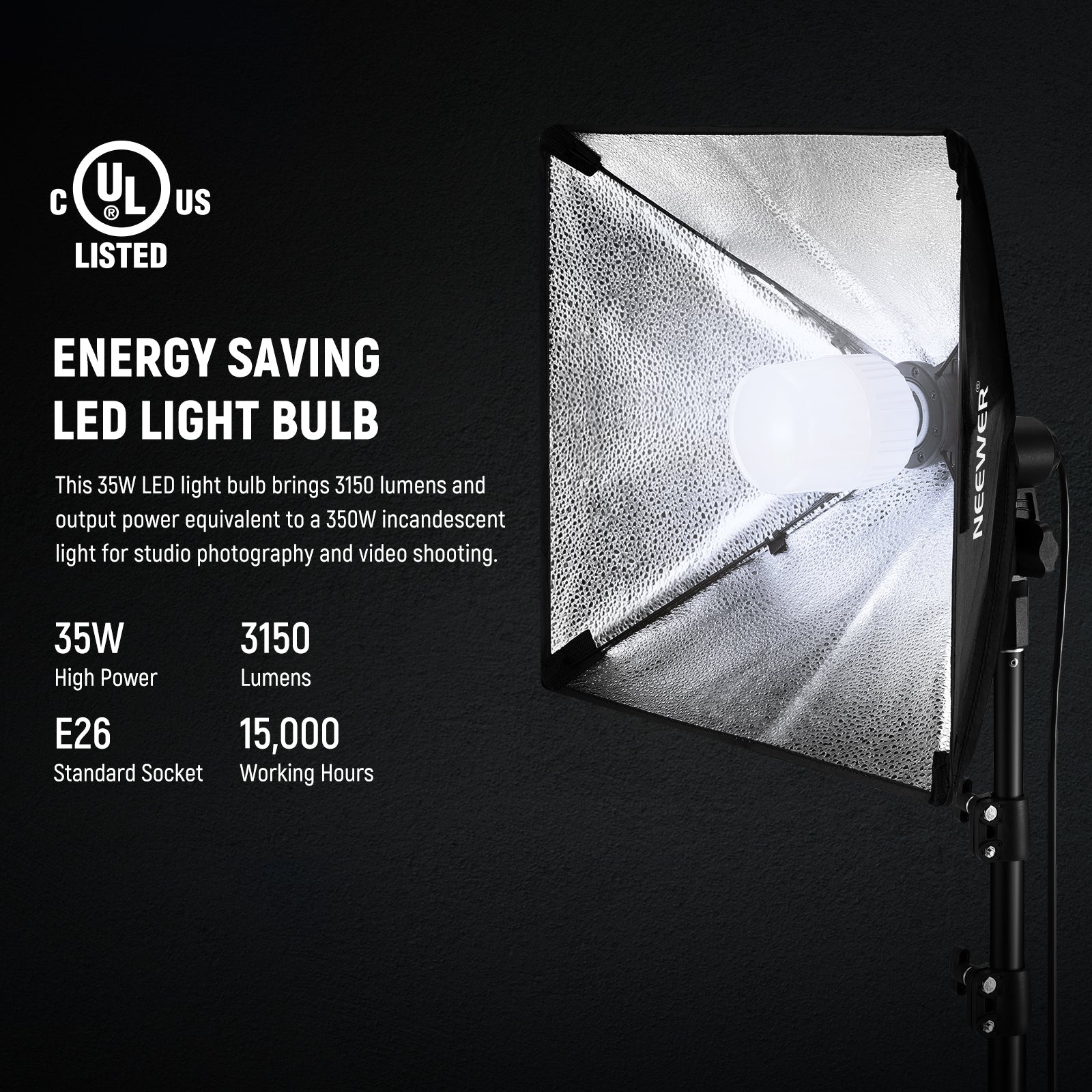- Kit de iluminación de caja de luz continua : esta bombilla LED de 35 W con certificación UL de primera calidad produce una salida de luz continua sin ningún parpadeo, lo que es agradable a la vista. La temperatura de color de 5700K ofrece un color de luz diurna natural y consistente en sus tomas, y CRI 93+ garantiza una reproducción precisa del color.