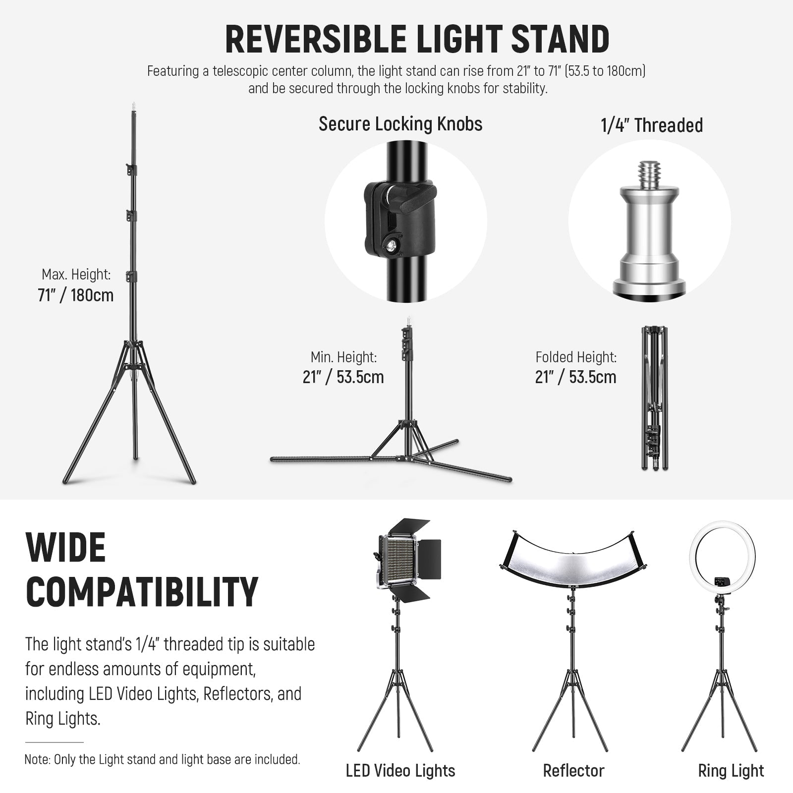 - Soporte de luz plegable reversible : el soporte de luz reversible con 3 secciones telescópicas puede extenderse hasta 6 pies (180 cm) para diferentes requisitos de altura y plegarse a un tamaño pequeño para un almacenamiento y transporte sencillos.
