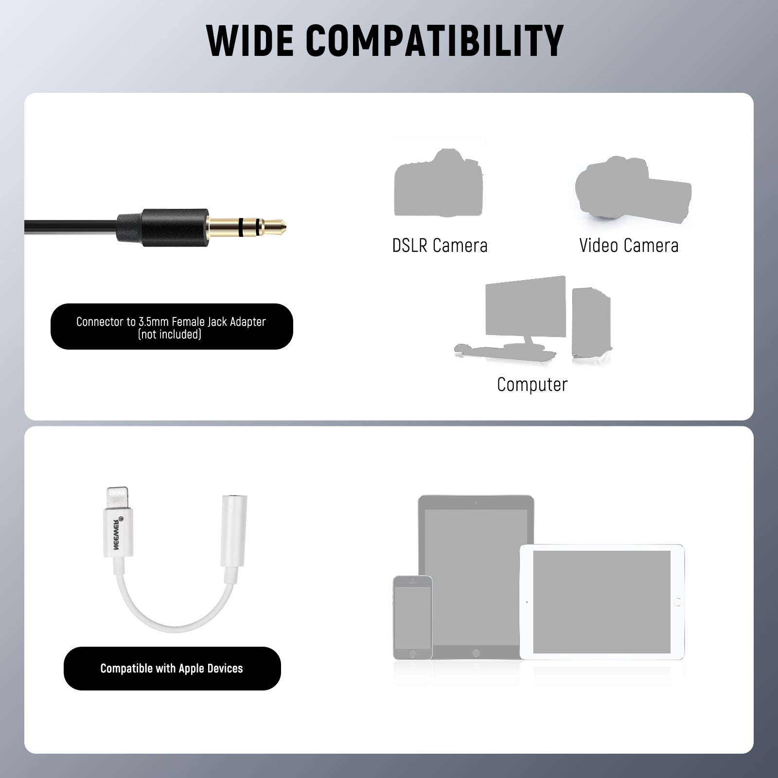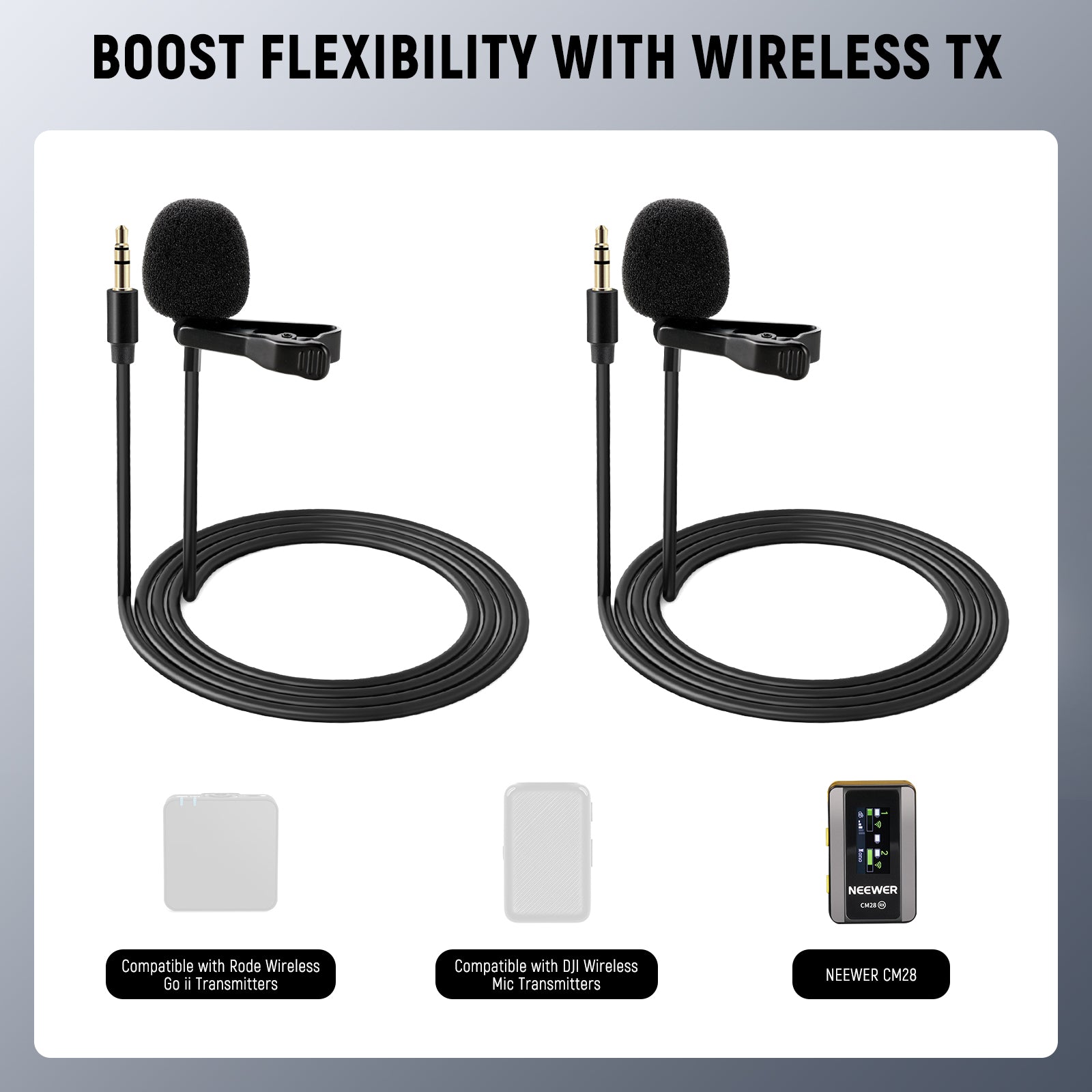 - Compatibilidad universal : Compatible con smartphones, cámaras, videocámaras y grabadoras de audio con conector TRS de 3,5 mm. También compatible con Rode Wireless GO II; compatible con el transmisor de micrófono inalámbrico DJI y los sistemas de micrófono inalámbrico NEEWER CM28/CM31. Nota: No compatible con sistemas de micrófono Sony.