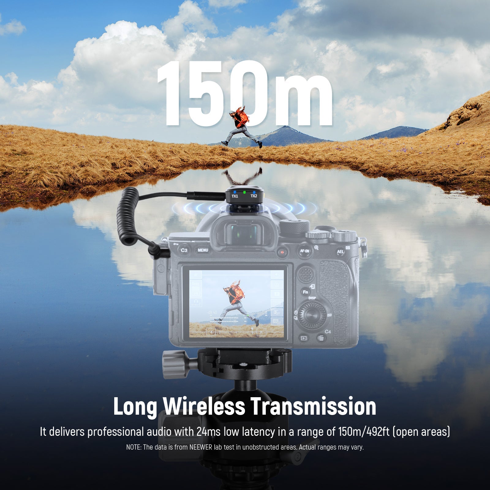 - Wireless Microphone System- This clip on lavalier mic set includes a receiver (RX), two transmitters (TX), and a charging case. The RX and TX pair automatically out of the case. With a 48kHz/24-bit sampling rate and a full 20Hz–20kHz frequency range, it delivers professional audio with 24ms low latency in a range of 150m (open areas). Perfect for fitness instructor micd up for sport, interviews, online teaching, Zoom, podcasting, TikTok/YouTube social media starter tool kit for live streaming