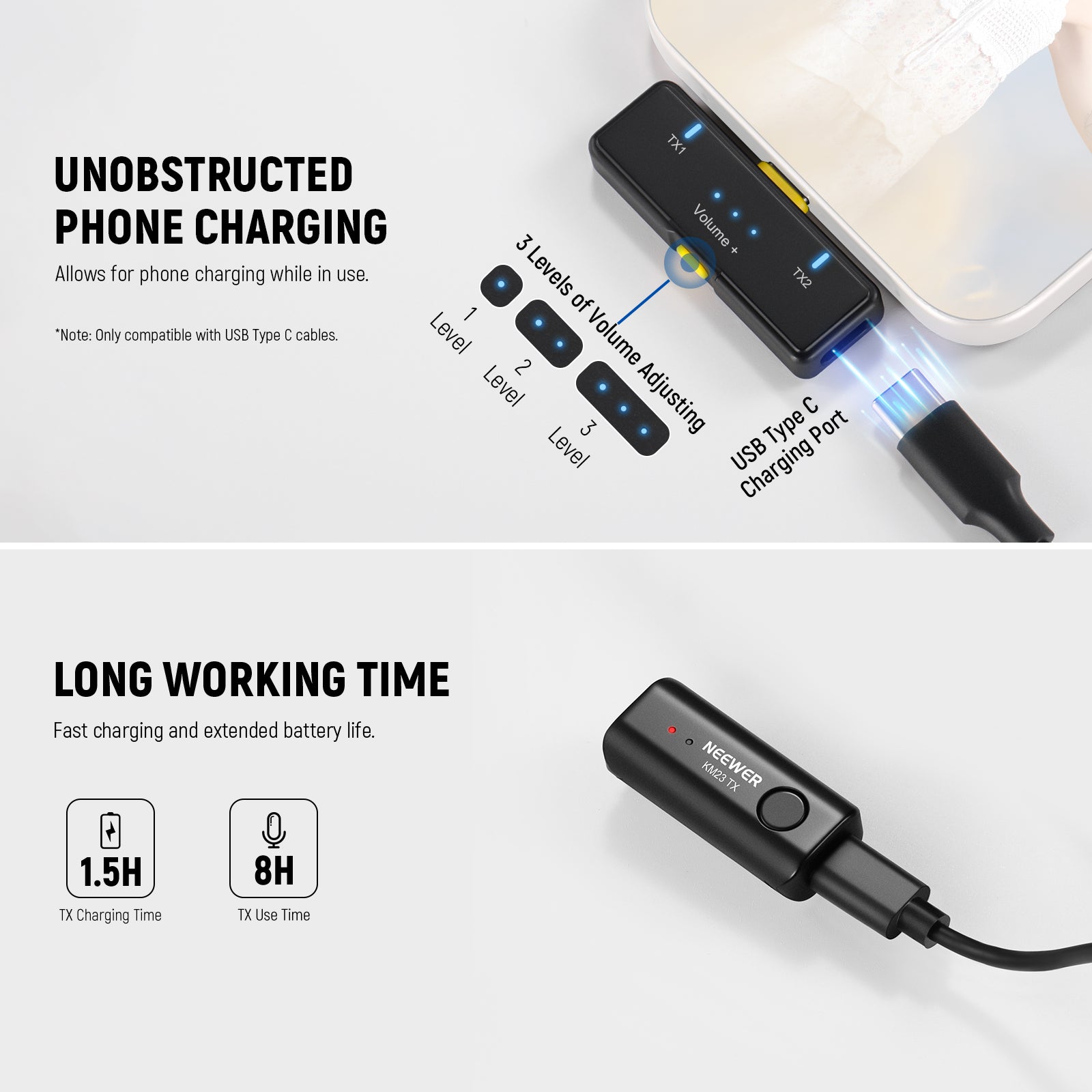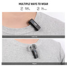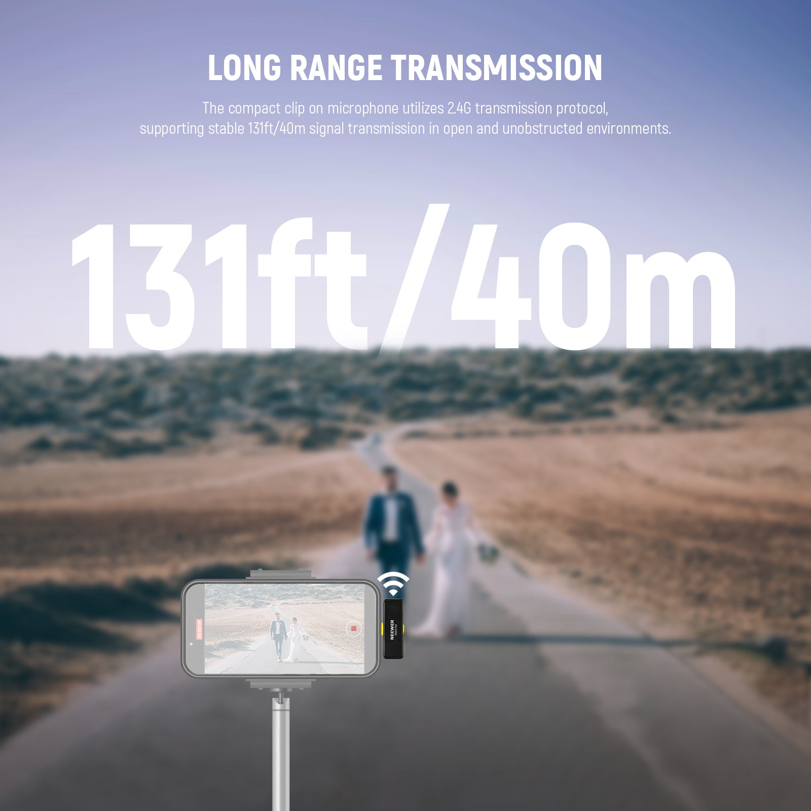 - Transmisión estable y 7 horas de duración de la batería : El pequeño micrófono de clip utiliza el protocolo de transmisión 2.4G, lo que permite una transmisión de señal estable a 40 m (131 pies) en entornos abiertos y sin obstáculos. El transmisor tiene una autonomía de 8 horas y tarda 1,5 horas en cargarse por completo. Disfruta de la comodidad de cargar tu teléfono directamente a través de la interfaz tipo C del receptor.