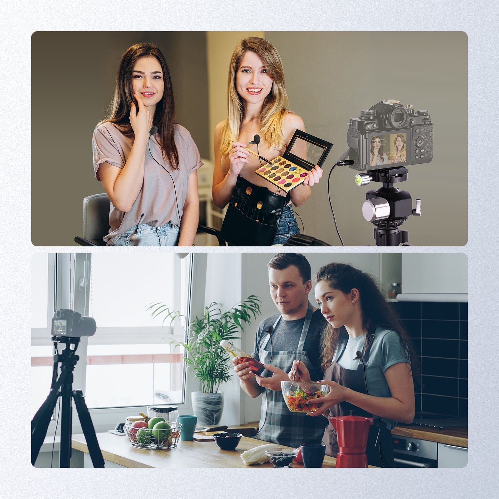 - Juego de micrófonos de solapa duales : graba el sonido de dos personas simultáneamente, ideal para entrevistas, kit de vlogs de inicio de YouTube, vlogs de redes sociales de TikTok, podcasts, podcasting, grabación de videos, transmisión en vivo o cualquier situación en la que se necesiten capturar dos fuentes de sonido