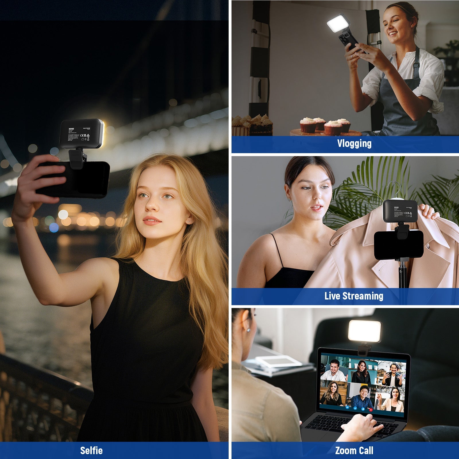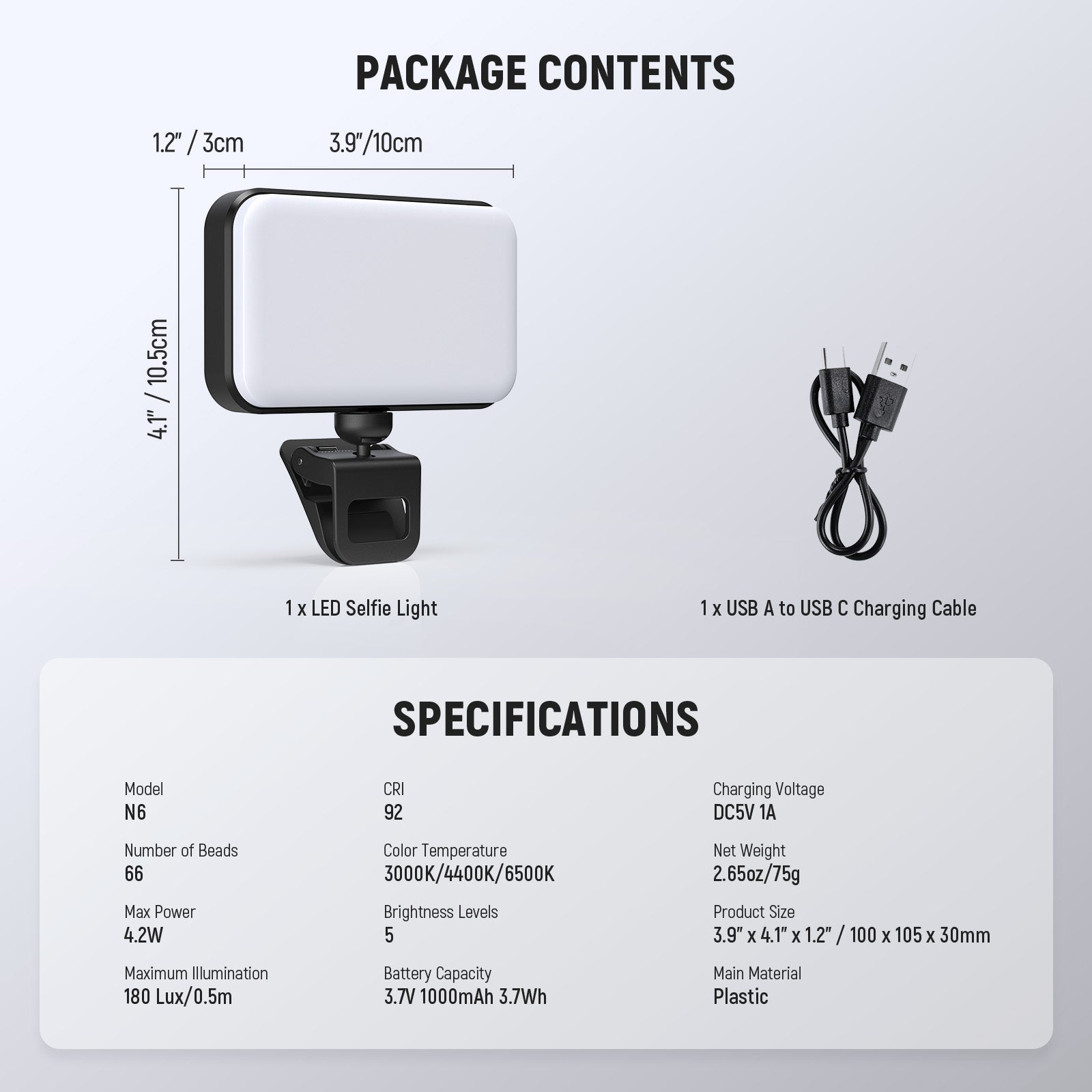 - Versatile Photography Lighting Kit- Includes 1 x LED selfie light, 1 x mounting clip, and 1 x USB A to USB C charging cable. This LED light brightens up your skin and make you look better on camera, whether you are attending a Zoom meeting, live streaming on social media, filming a vlog for your YouTube/TikTok channel, making podcast videography as a content creator, or simply looking for a makeup light as a makeup artist