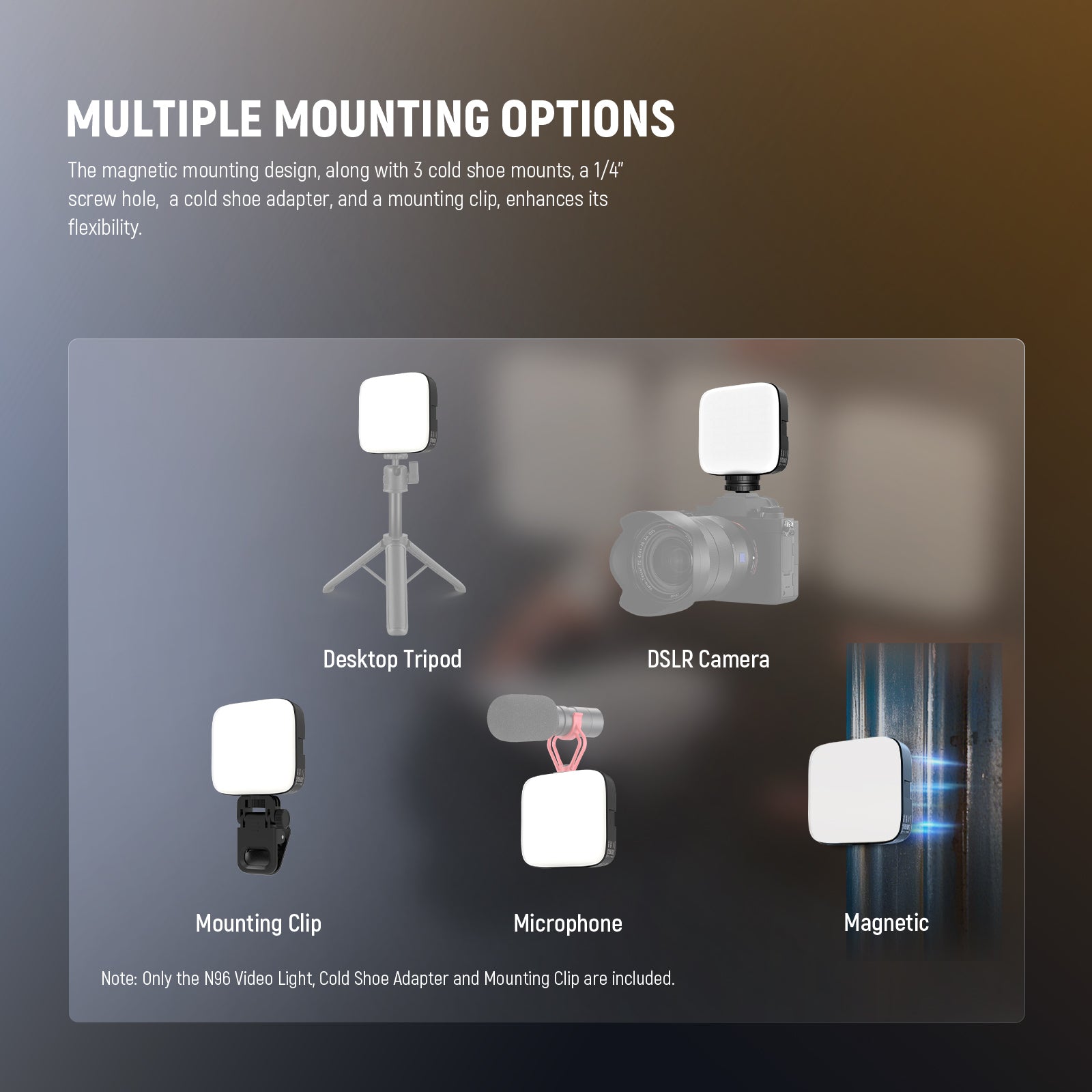 - Compact & Portable Camera Light- The N96 is a pocket sized mini LED fill cube panel light for cameras photography, measuring 3"x3"x1.4"/76x76x35mm, weighing only 3.8oz/108g with the diffuser. Also can be clamped on a laptop or magnetically attached to capture beautiful moments as a key or fill light. The simple physical button and knob streamline lighting control, essential gear and must have selfie light for social media content creators, makeup artists, live streamers, and influencers
