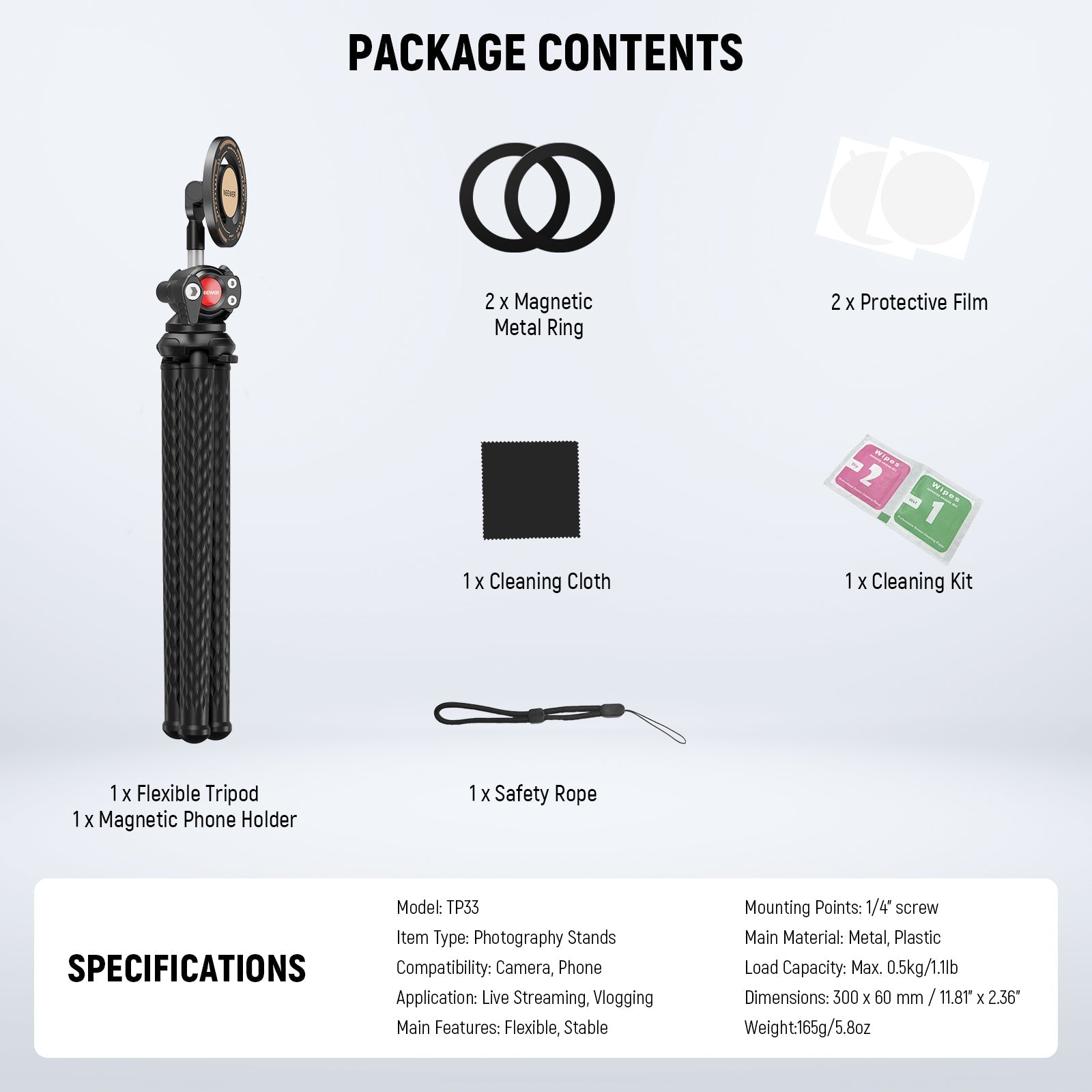 Trípode magnético flexible para teléfono NEEWER TP33 con cabezal esférico y anillo de metal