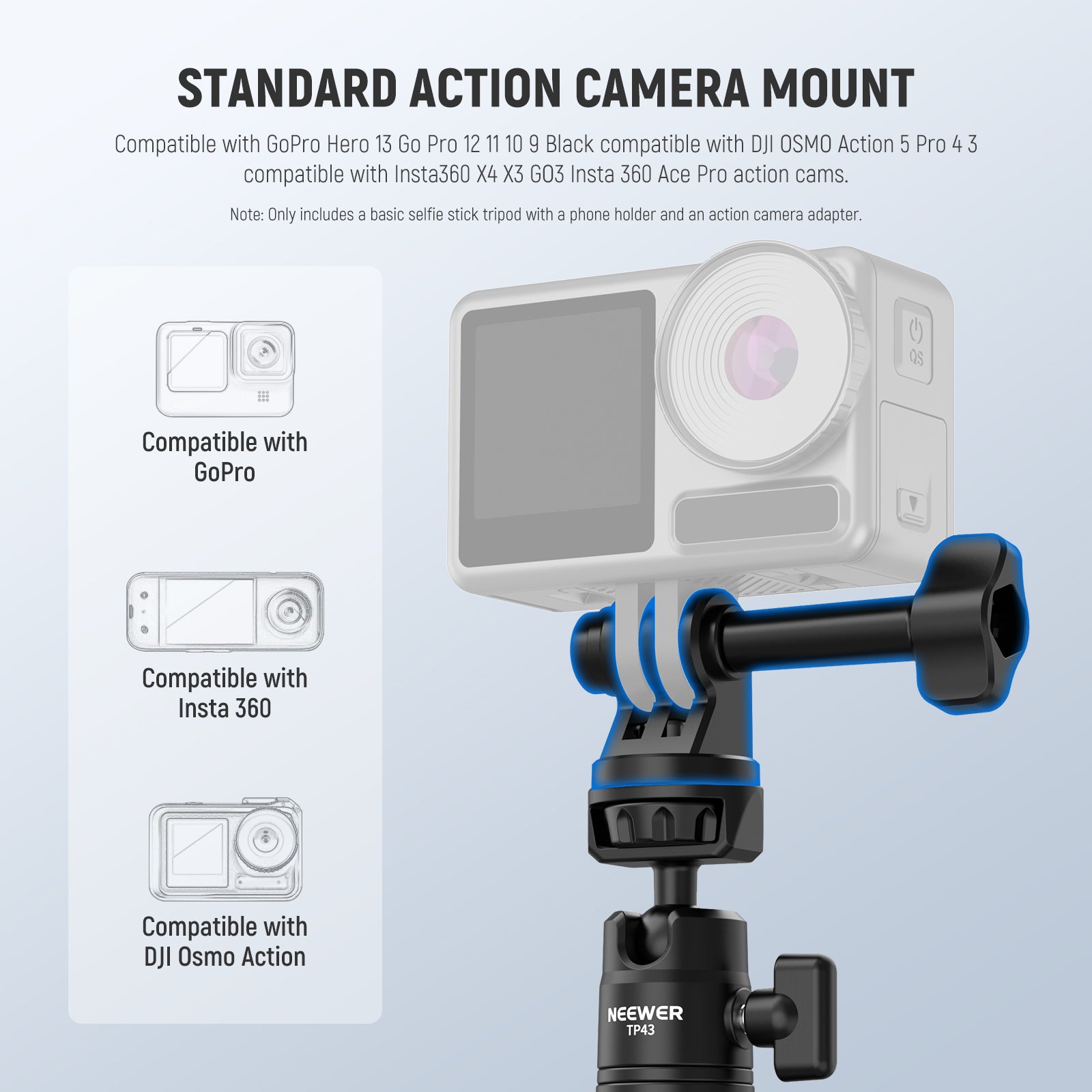 - Tripod Stand for Phone & Action Camera- The adjustable phone holder clip is compatible with iPhone 16 15 Pro Max Plus 14 13 Samsung Galaxy S24 S23 Ultra Google Pixel 9 8 7 Pro Android mobile, with one cold shoe for photography and videography accessories, gears, or equipment like a monitor, fill light, microphone. The mount adapter is compatible with GoPro Hero 13 Go Pro 12 11 10 9 Black compatible with DJI OSMO Action 5 Pro 4 3 compatible with Insta360 X4 X3 GO3 Insta 360 Ace Pro action cams