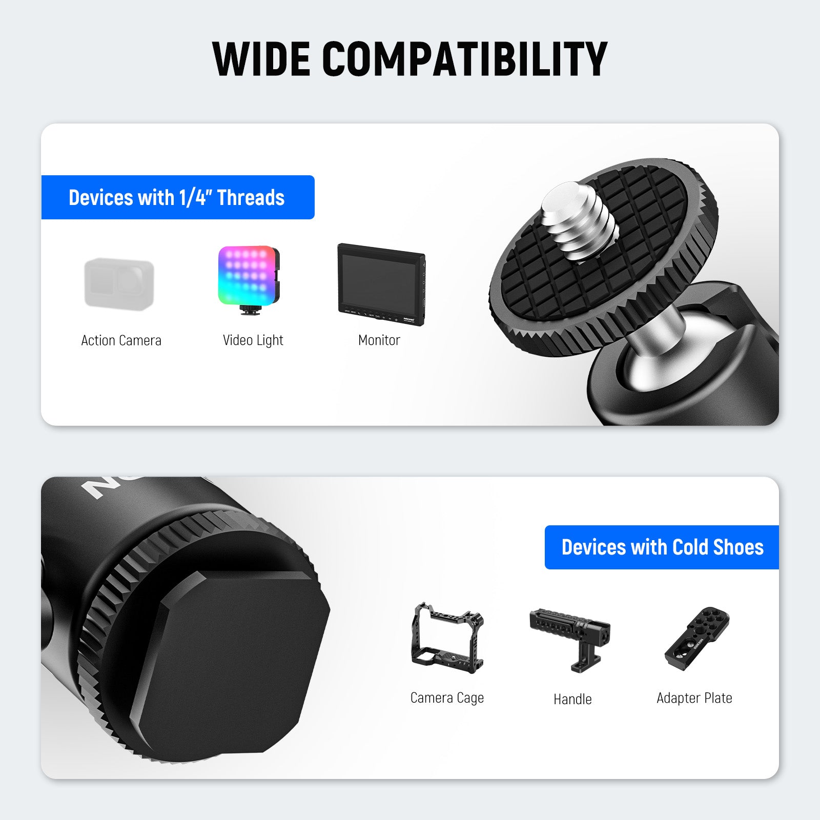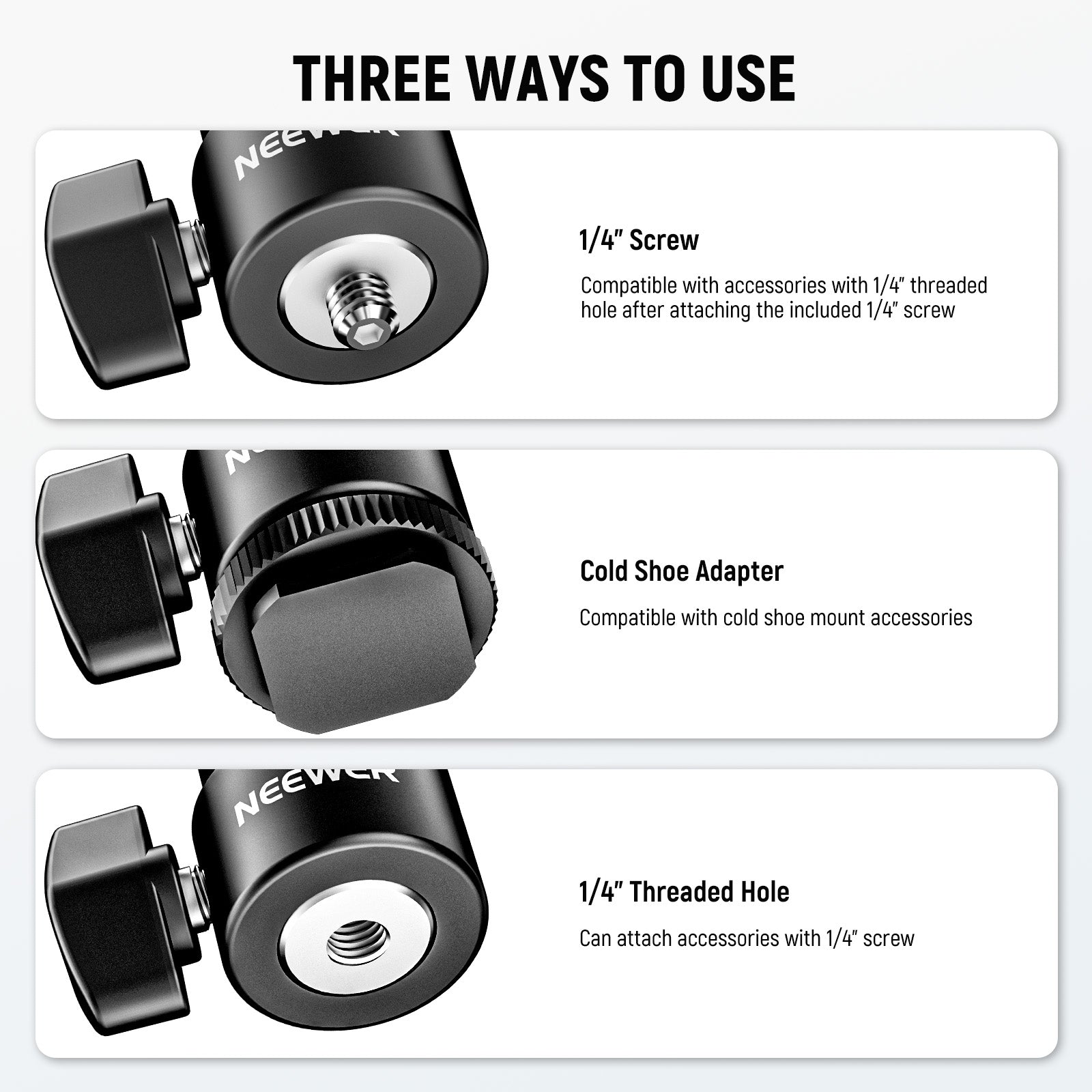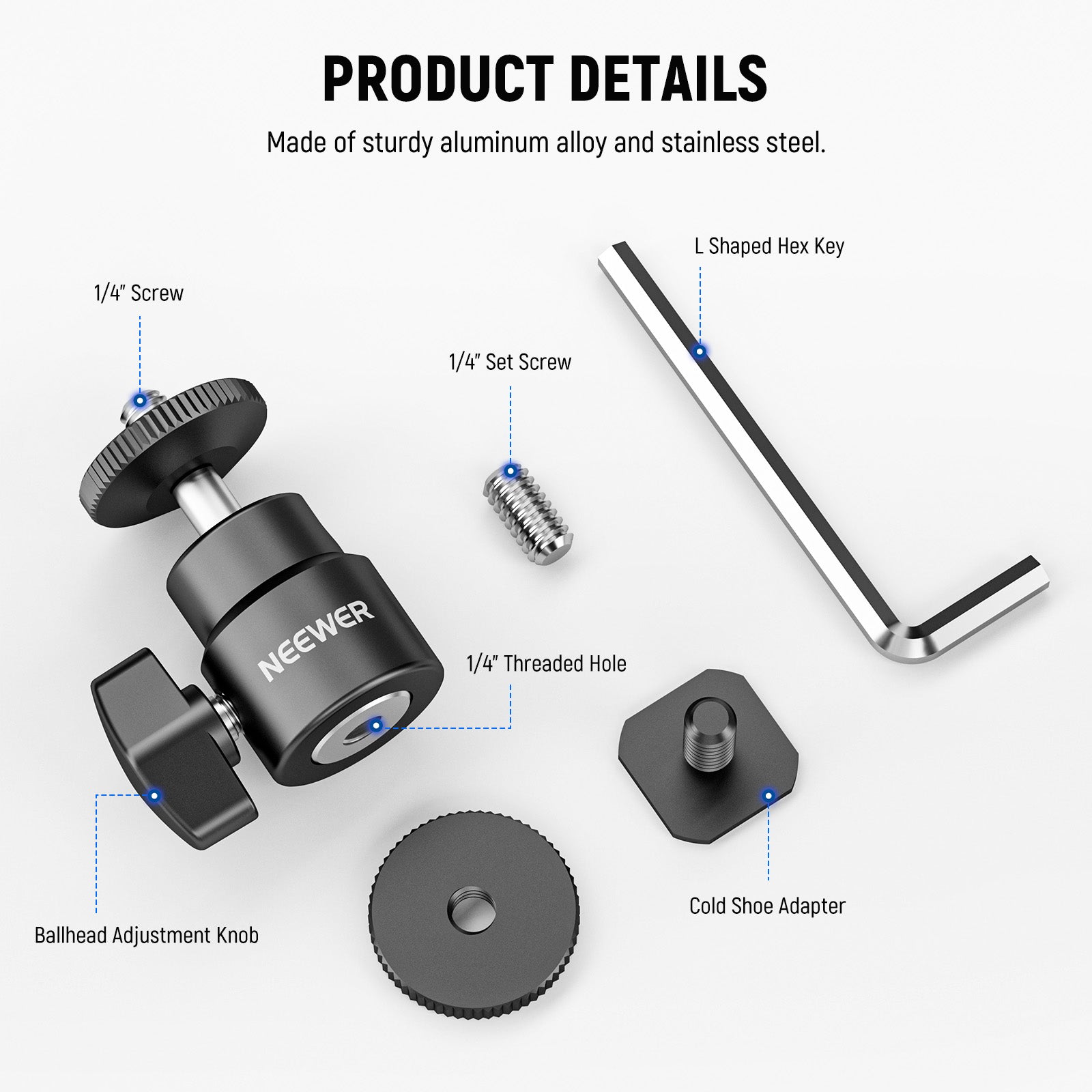 - Mini cabeza de bola. Monte su cámara de forma segura a través del adaptador de zapata fría inferior. El tornillo superior de 1/4” le permite montar una amplia gama de dispositivos, como luz de relleno LED, flash LED, monitor de campo y otros accesorios con un orificio roscado de 1/4”.